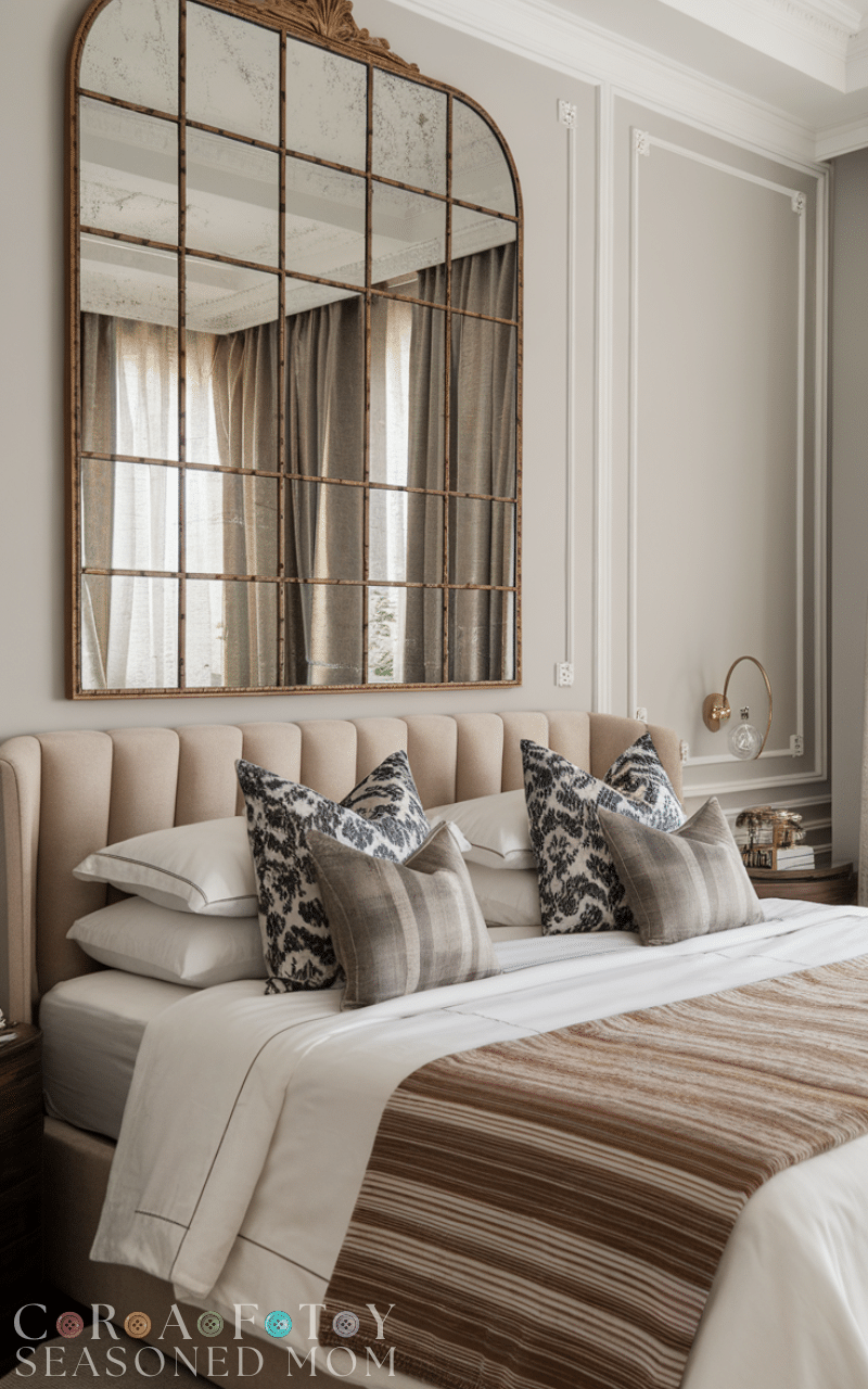 A large mirror above the bed instantly brightens and expands a room. I strategically place mirrors to reflect light and create a sense of airiness, and a unique frame can add character. Pairing it with subtle wall accents makes the Above Bed Decor feel elegant, and it’s especially great for smaller bedrooms that need visual depth.
