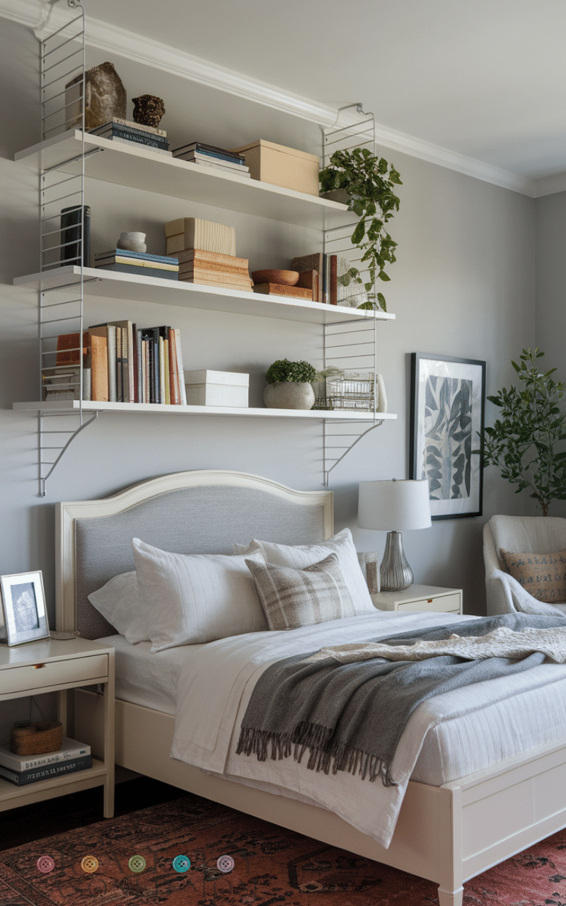 Floating shelves are perfect for combining functionality with style. I like displaying books, plants, or small decorative pieces, layering them at different heights to add visual interest. Painting or staining shelves to match the room keeps the look unified, and adding personal touches makes the bedroom warm and unique.