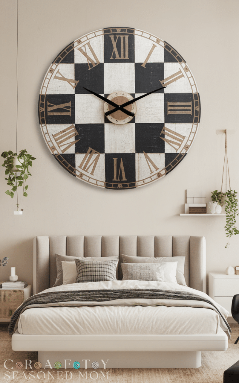 A large clock serves as both decor and functional art. I love picking unique materials or styles to make a statement, and pairing it with minimal accents keeps the focus clean. This type of Above Bed Decor makes a bedroom feel practical yet stylish.
