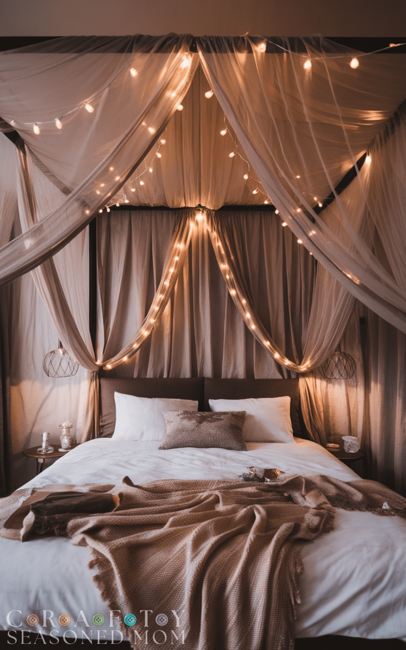 A canopy instantly adds romance and elegance. I love using sheer fabrics or flowing drapes to make the bed feel like a sanctuary. Adding fairy lights or soft textures enhances the cozy atmosphere and draws the eye upward, making the bed the centerpiece of the room.