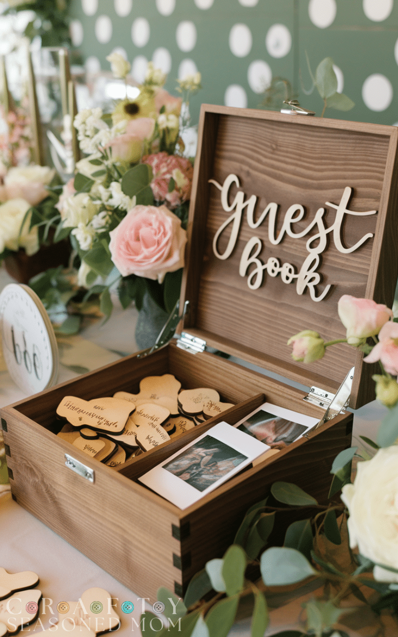 Set out a stylish guest book drop box where attendees can sign and drop wooden shapes, tags, or Polaroids with their names and messages. This modern take on baby shower activities that are not games becomes a meaningful keepsake and a beautiful decorative piece for the baby’s room.