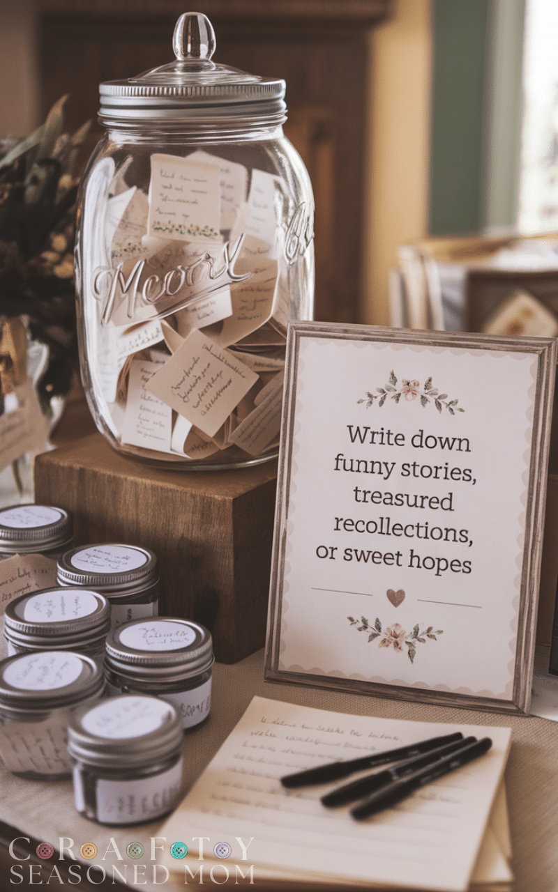 Invite guests to jot down funny stories, treasured recollections, or sweet hopes and place them into a memory jar or book. These heartfelt entries become one of the most cherished baby shower activities that are not games, offering the parents a beautiful collection to enjoy when reflecting on the special day.