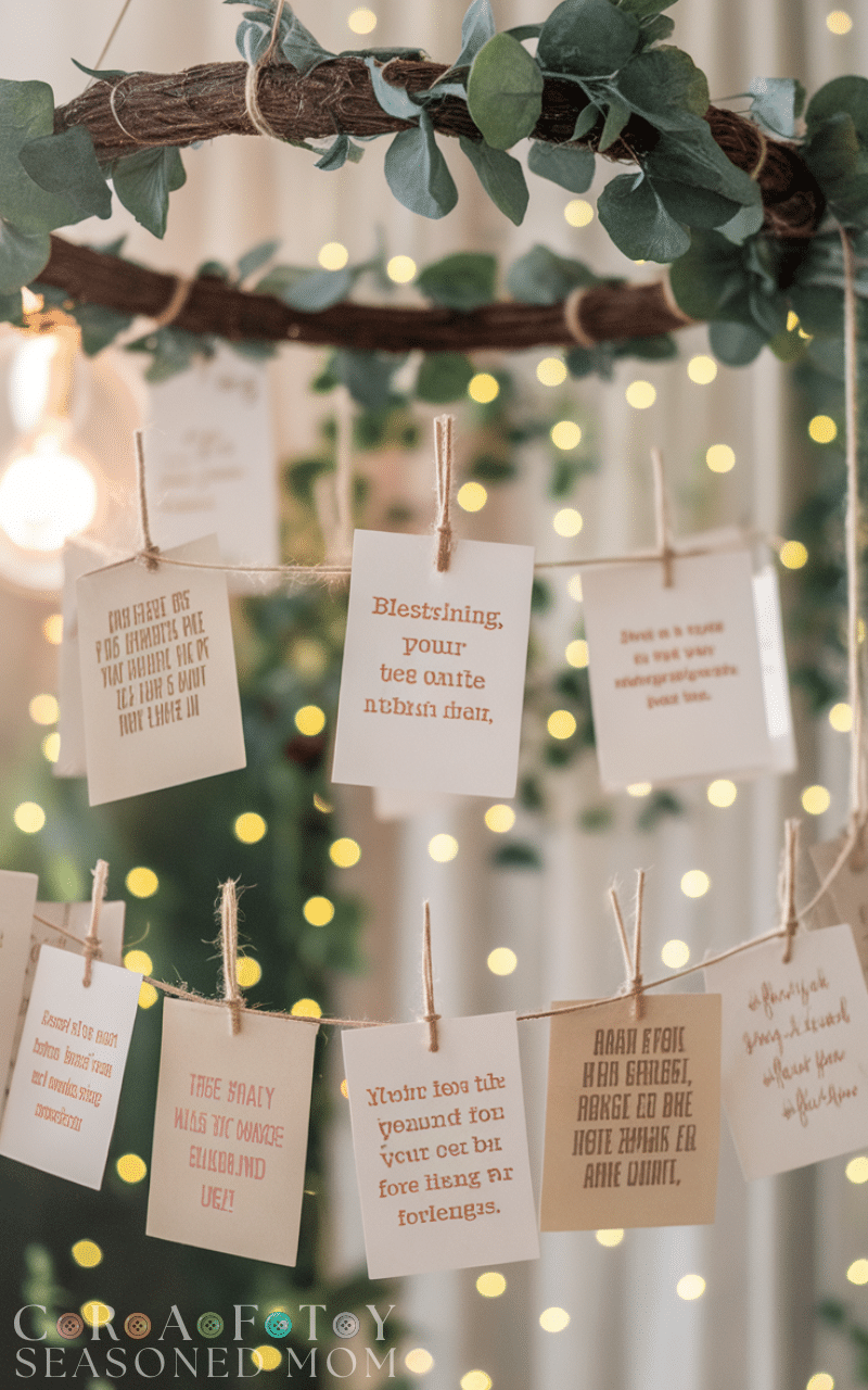 For a spiritually uplifting option among baby shower activities that are not games, have guests write blessings, quotes, prayers, or positivity messages on small cards and tie them to a decorative ring. Over time, it becomes a treasured keepsake that can be hung in the nursery as a constant source of encouragement and love.