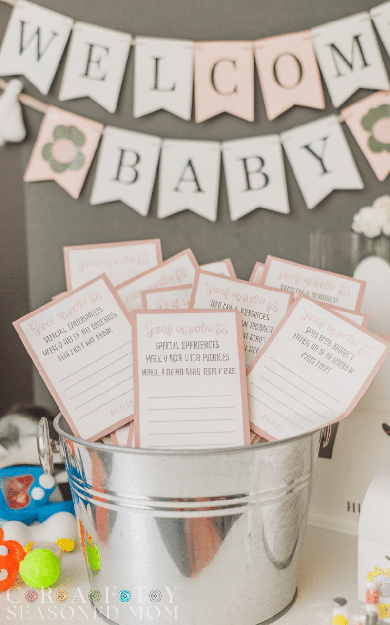 Invite guests to write down special experiences or milestones they hope the baby will enjoy during their first year and place the cards into a cute bucket. This thoughtful activity is a classic example of baby shower activities that are not games, offering warm, forward‑looking inspiration and a keepsake full of sweet ideas.