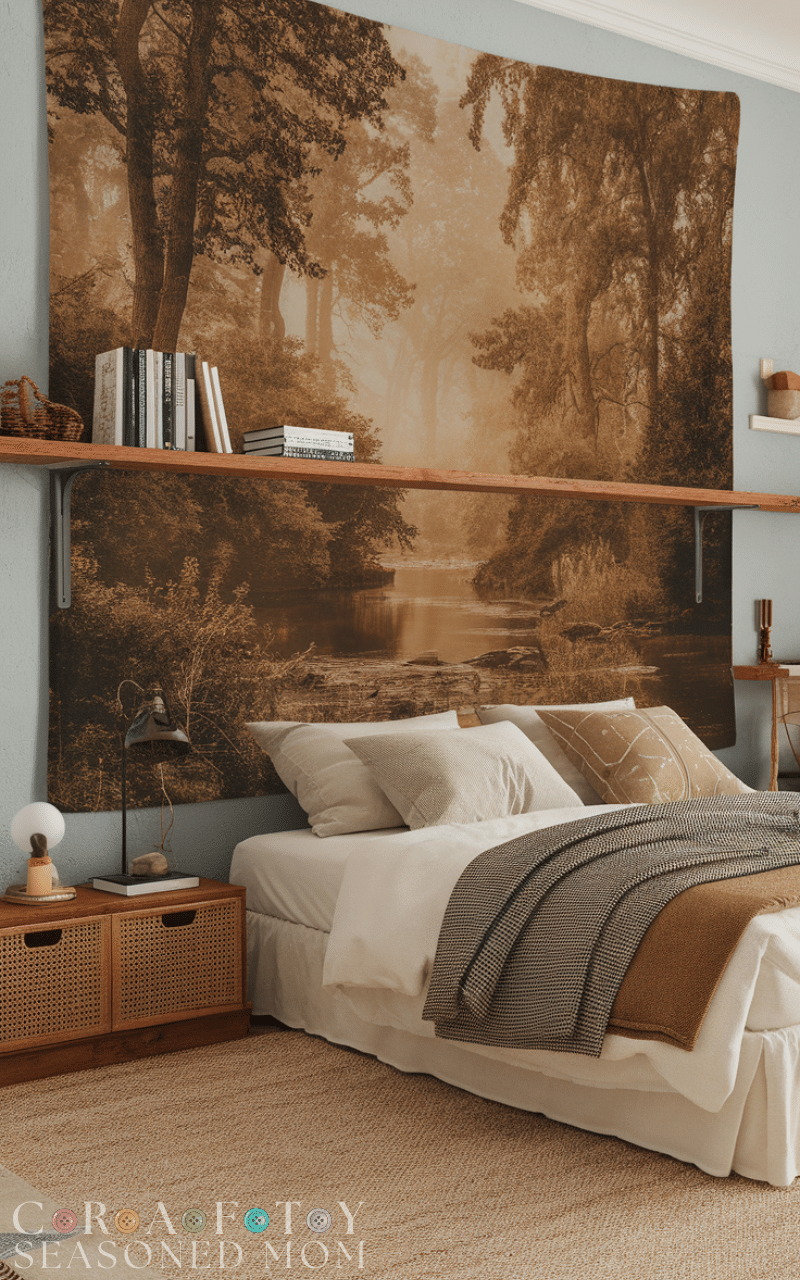Whether you choose a large, colorful photo from a local art shop or a “courtyard” wallpaper mural that blends into your paint color, the goal is to add “visual texture.” By mixing soft fabrics, woven baskets, and intentional art, you transform an empty slate into a sophisticated, personal retreat.