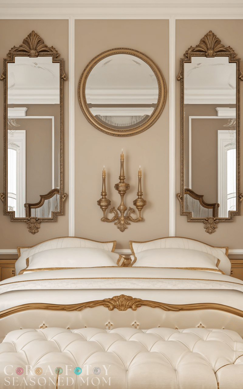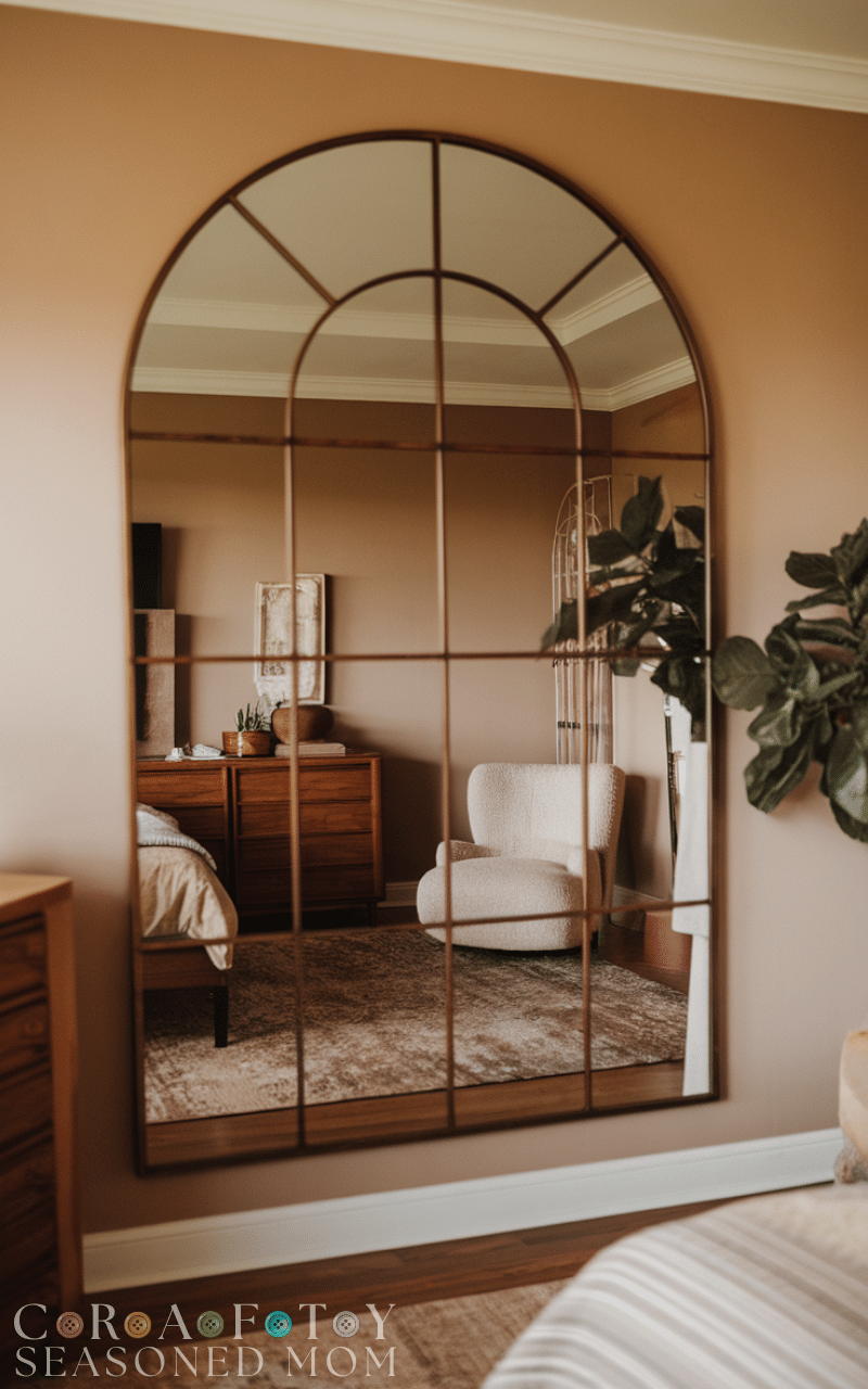Bedroom wall ideas often include mirrors because they reflect light and make the room feel bigger. A round or arched mirror adds softness and elegance to bedroom walls. These bedroom wall decor ideas are especially useful in small bedrooms that need brightness and depth. Mirrors also double as functional décor, blending beauty with practicality effortlessly.