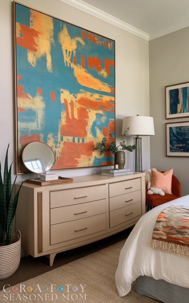 Bedroom wall ideas become bold and elegant when you add one large statement artwork above the bed or dresser. A single oversized piece creates focus and reduces visual clutter. These bedroom wall decor ideas work beautifully in minimalist bedrooms where less is more. Choose calming landscapes, abstract art, or neutral photography to maintain a relaxing atmosphere while still making an impact.