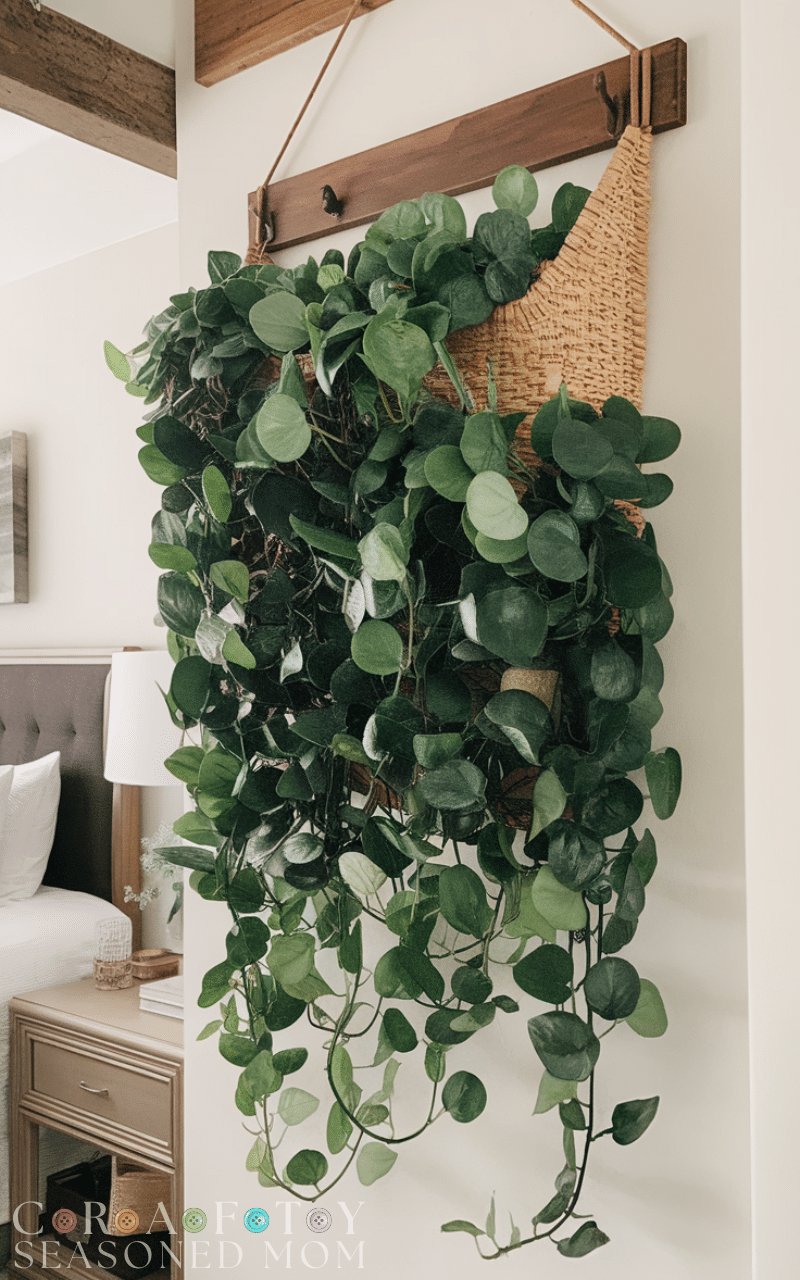 Bedroom wall decor ideas come alive with hanging plants or wall-mounted planters. Greenery adds freshness and improves the room’s energy. These bedroom wall decor ideas work best with low-maintenance plants like pothos or faux greenery if light is limited. Plants soften walls and create a peaceful, natural vibe.