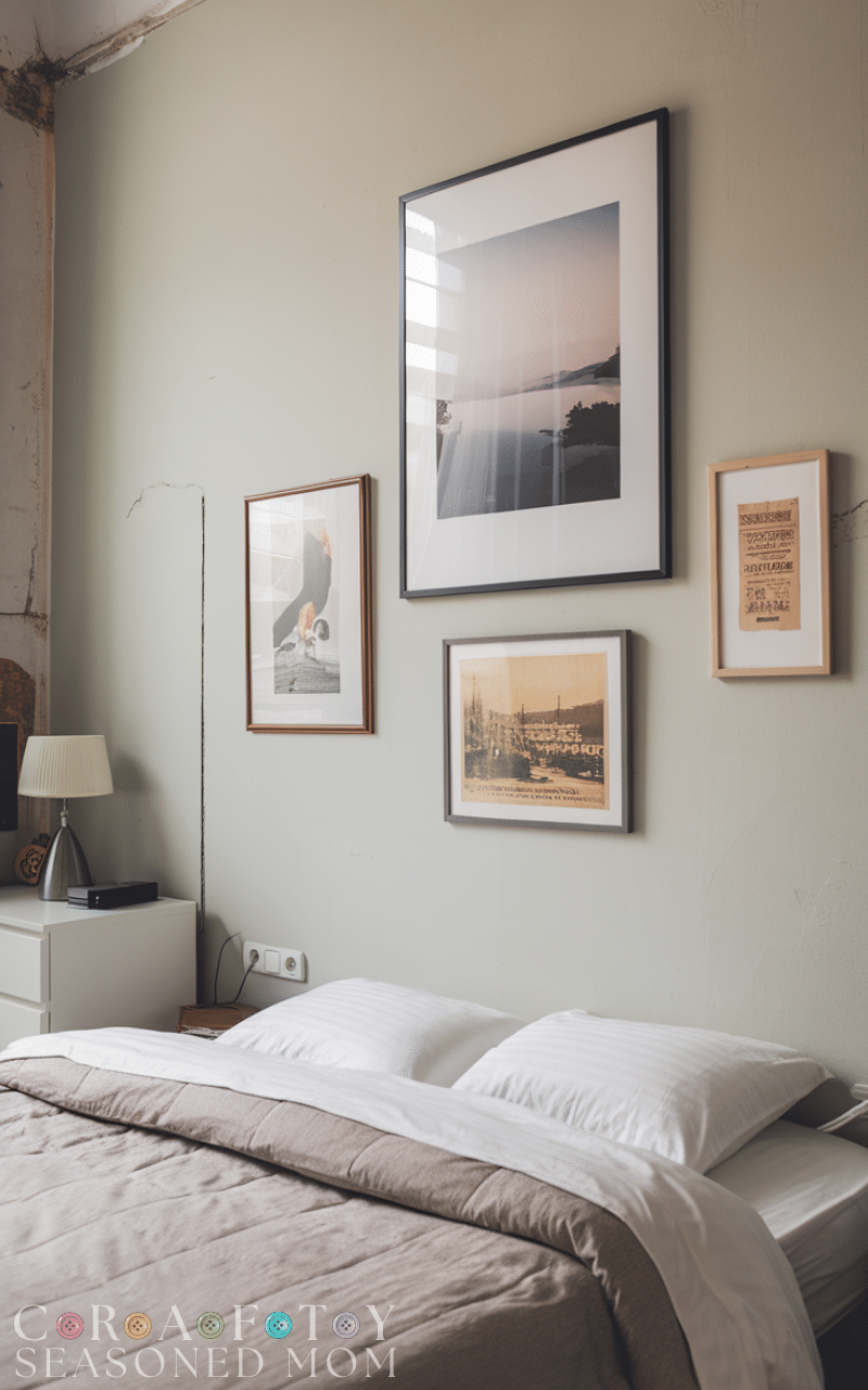 Bedroom wall ideas feel instantly personal with a gallery wall made of framed art, photos, or prints you love. Mixing different frame sizes while keeping a consistent color palette creates balance without chaos. These bedroom wall decor ideas let you tell your story visually, whether through travel photos, abstract art, or soft illustrations. For a calm bedroom vibe, choose muted tones and simple frames that don’t overwhelm the space but still add character and warmth.