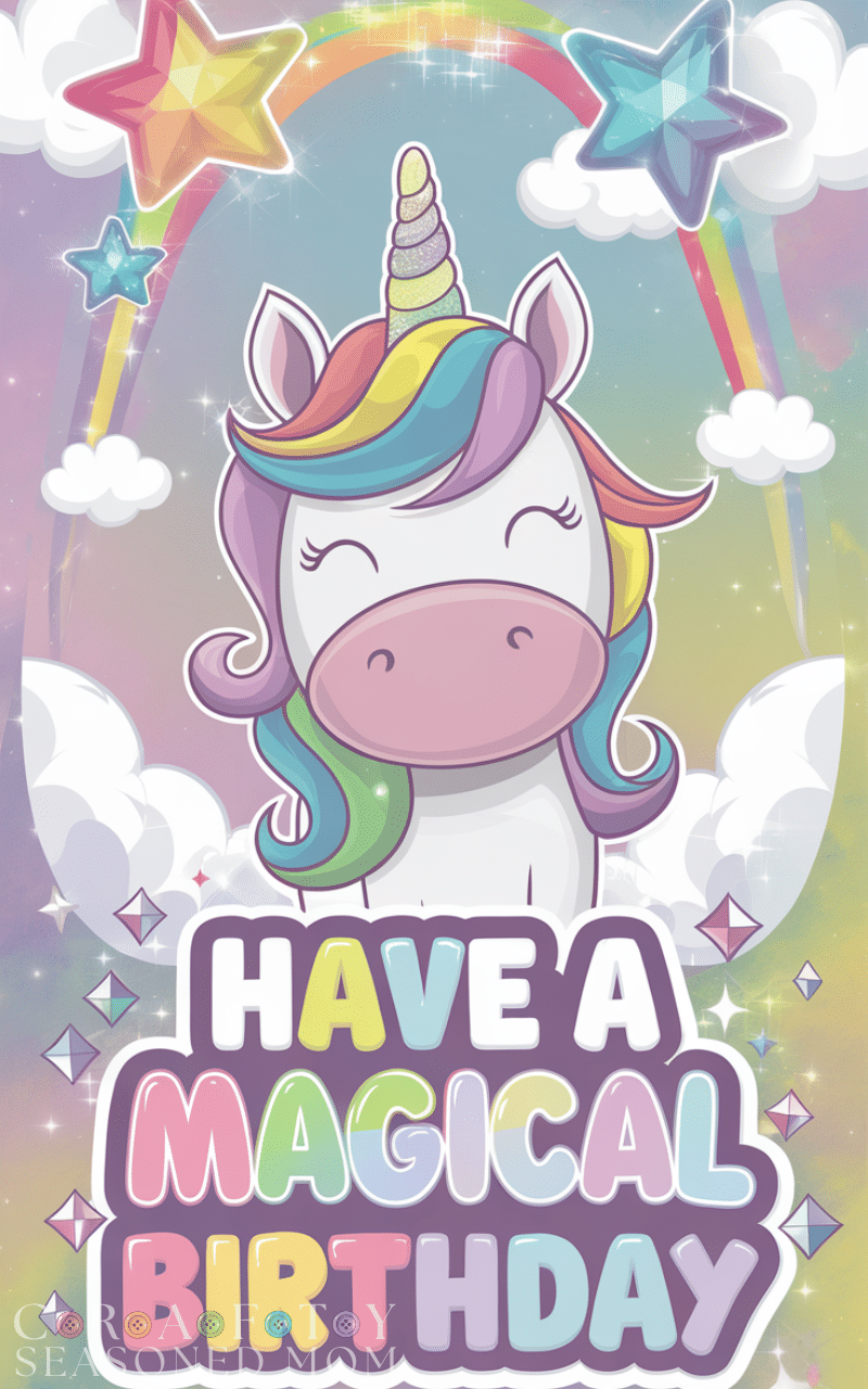 A unicorn magic card is one of the most whimsical Birthday Card Ideas for Tween Girls because it brings imagination and color together. I usually draw or print a cute unicorn with a rainbow mane and add glitter around the horn to make it sparkle.