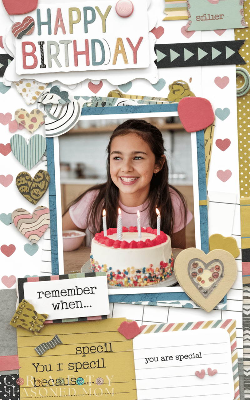 A scrapbook memory card is one of the most meaningful Birthday Card Ideas for Tween Girls because it celebrates special moments. I like printing tiny photos or cutting pictures from magazines that match her favorite hobbies or interests.