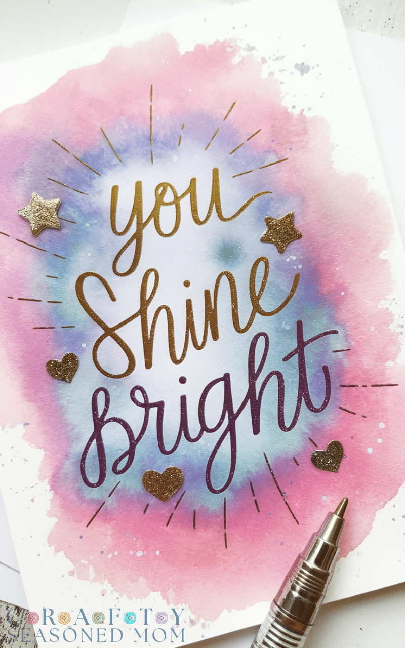 A watercolor dream card is one of the most artistic Birthday Card Ideas for Tween Girls because it feels soft, colorful, and full of personality. I like starting with gentle watercolor shades such as pink, lavender, or sky blue and blending them together to create a dreamy background. When the colors dry, I write a sweet message like “You Shine Bright” using metallic gel pens so the words sparkle a little.