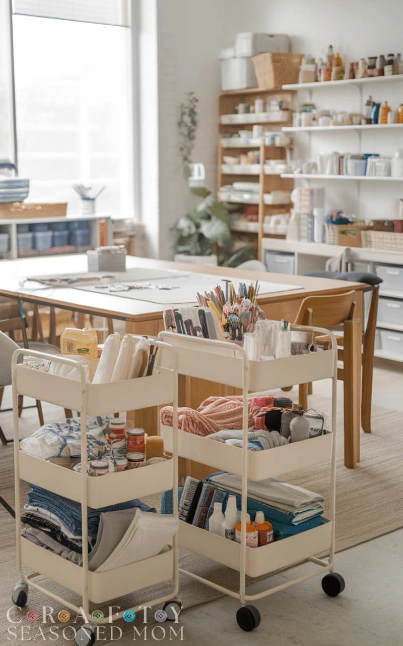Rolling carts are versatile craft room layout ideas. Move them around to hold supplies, tools, or project materials. They allow for a dynamic workspace and can be tucked away when not in use, saving valuable floor space.