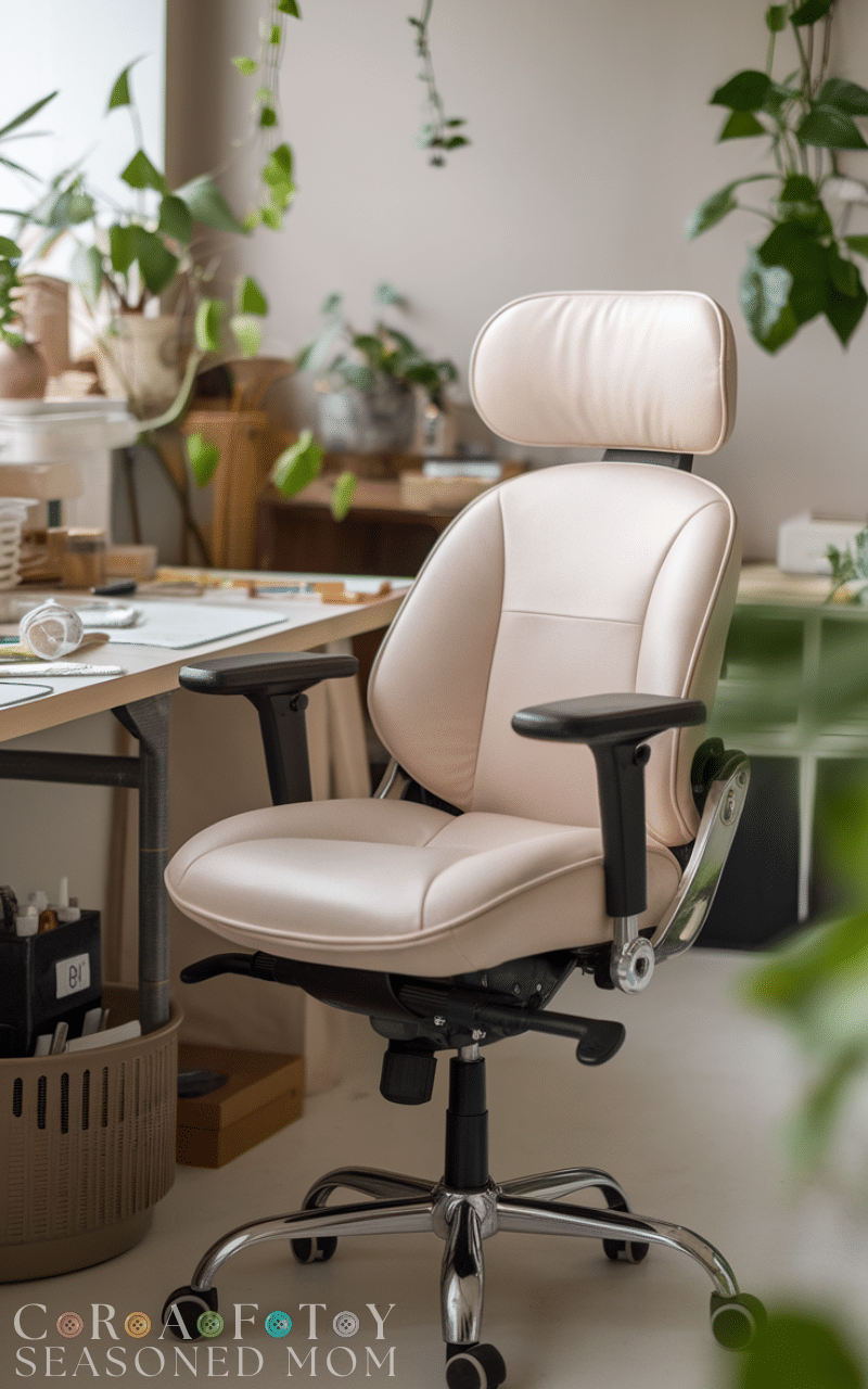 A good chair is vital in craft room layout ideas. Ergonomic or cushioned seating makes long crafting sessions comfortable and reduces fatigue. Choosing a chair on wheels adds mobility and convenience around your workspace.