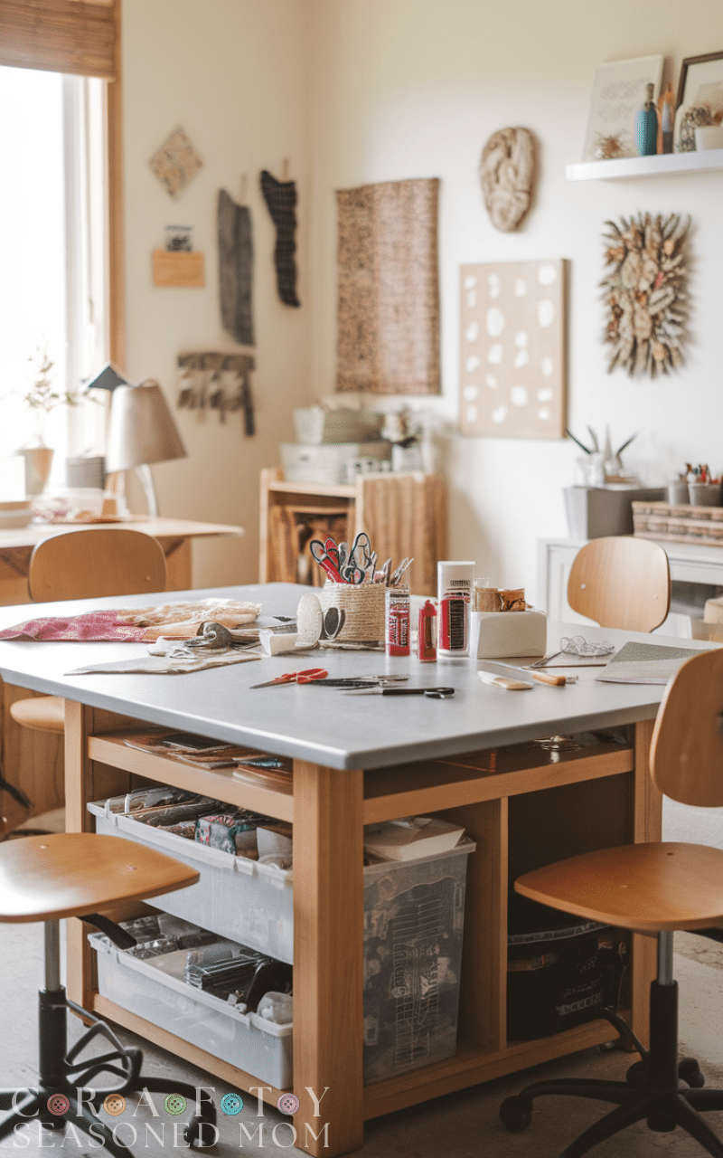 A central work table is key in craft layout ideas. It provides ample surface for projects and allows multiple people to work together. Keep the table clear with storage underneath for supplies, creating a functional and inviting workspace.