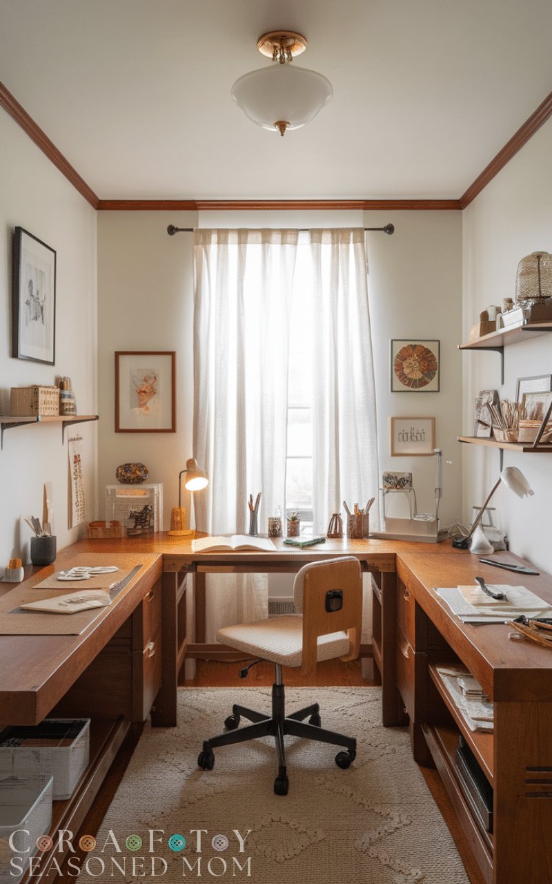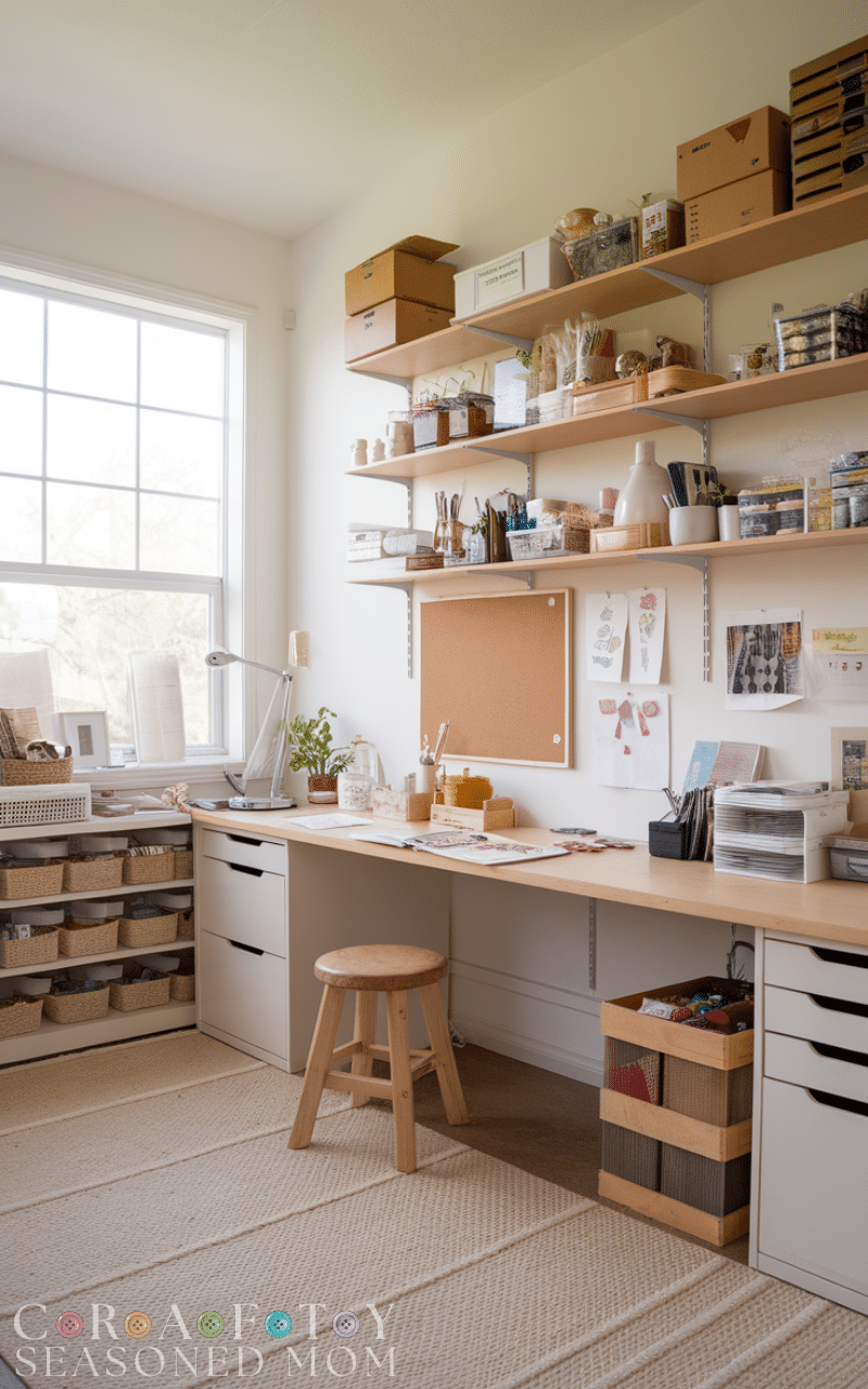 Natural light is a game-changer in craft room layout ideas. Place your desk or work area near a window for bright, cheerful illumination. It improves mood, makes colors more accurate, and creates a pleasant crafting environment.