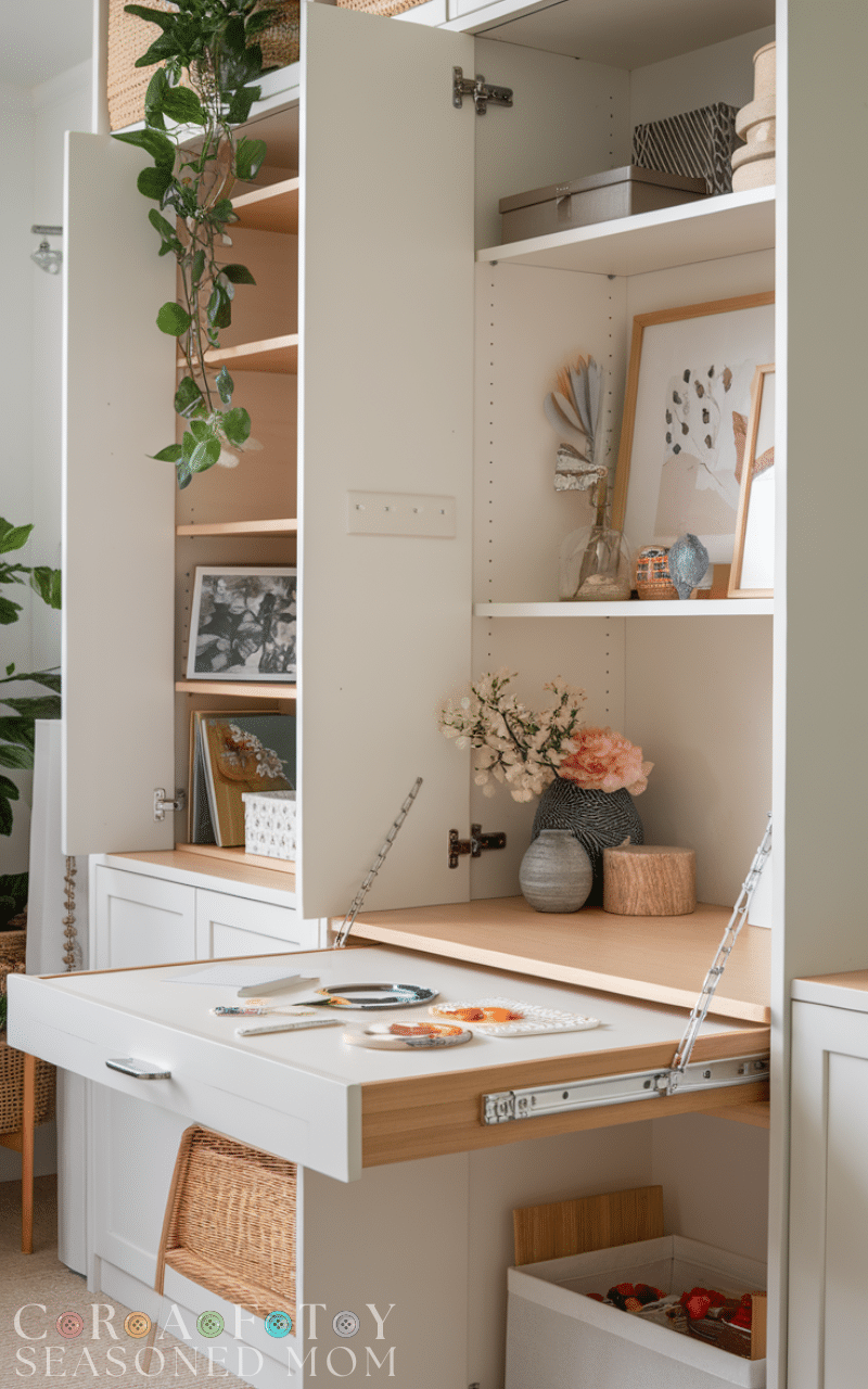 Foldable or pull-out surfaces are clever craft room layout ideas for small spaces. They provide extra work area when needed and can be tucked away to free up the room, maintaining a clean and functional layout.