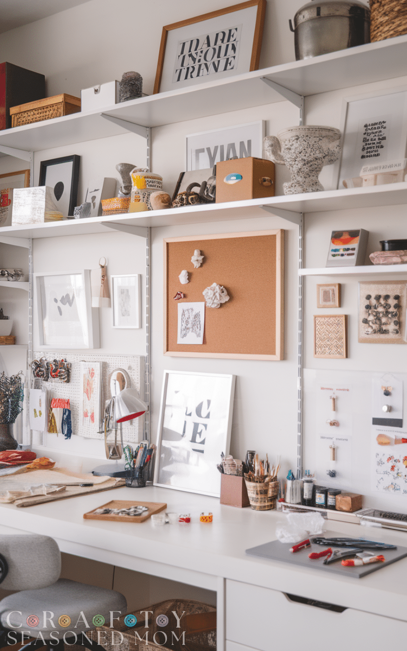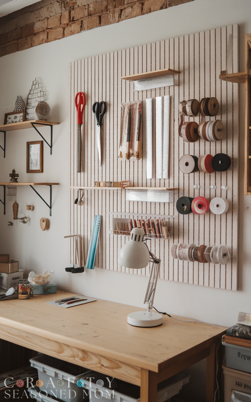 Pegboards are a staple in craft room layout ideas. Hang scissors, rulers, brushes, or spools of ribbon on hooks for easy access. This keeps your workspace neat and lets you find tools instantly.