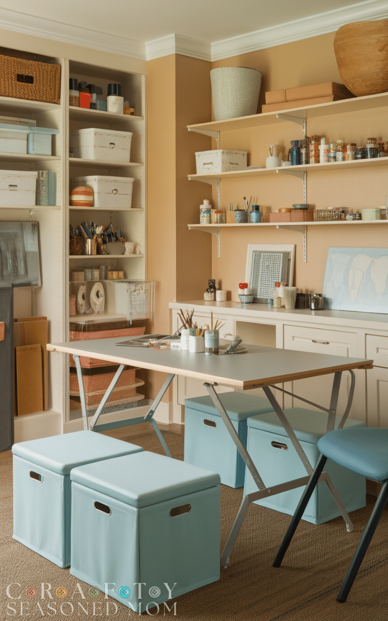 Multi-purpose furniture is smart in craft room layout ideas. Folding tables, storage ottomans, or benches with compartments provide workspace and storage simultaneously, helping small craft rooms feel spacious and organized.