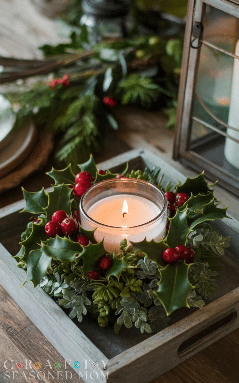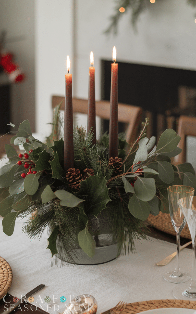 For a fresh and elegant look, try making an evergreen candle display because it is one of the easiest DIY Christmas centerpieces for table that instantly adds warmth. You can gather pine branches, holly, and eucalyptus and then place them around tall candles in the center of your table. The greenery gives off a lovely scent and when you light the candles the soft flicker creates a cozy and peaceful atmosphere that perfectly captures the spirit of Christmas.