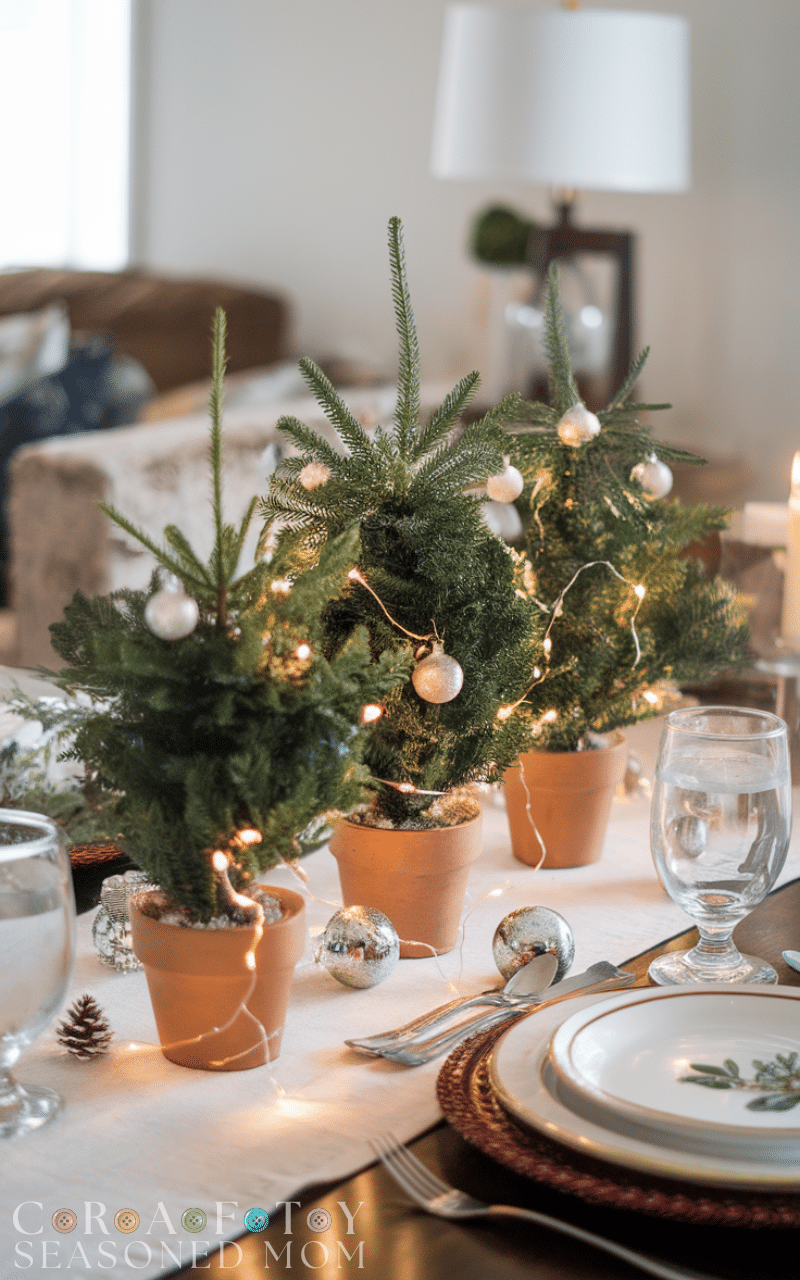 Mini tree pots are adorable and easy DIY Christmas centerpieces for table that bring a fun touch to your decor. You can plant small pine or cypress trees in festive pots and decorate them with mini ornaments and fairy lights. When you place several down the center of your table they make the space look joyful and alive while giving off that fresh pine scent everyone loves during the holidays.