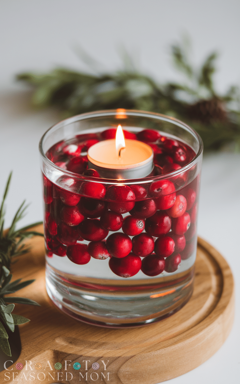 If you prefer something elegant and modern then this cranberry and candle glass arrangement is a wonderful DIY Christmas centerpiece for table. All you need to do is fill clear glass vases with fresh cranberries and water and then place floating candles on top. When you light them the reflection of the red berries and candlelight creates a stunning contrast that feels cheerful and sophisticated for Christmas celebrations.