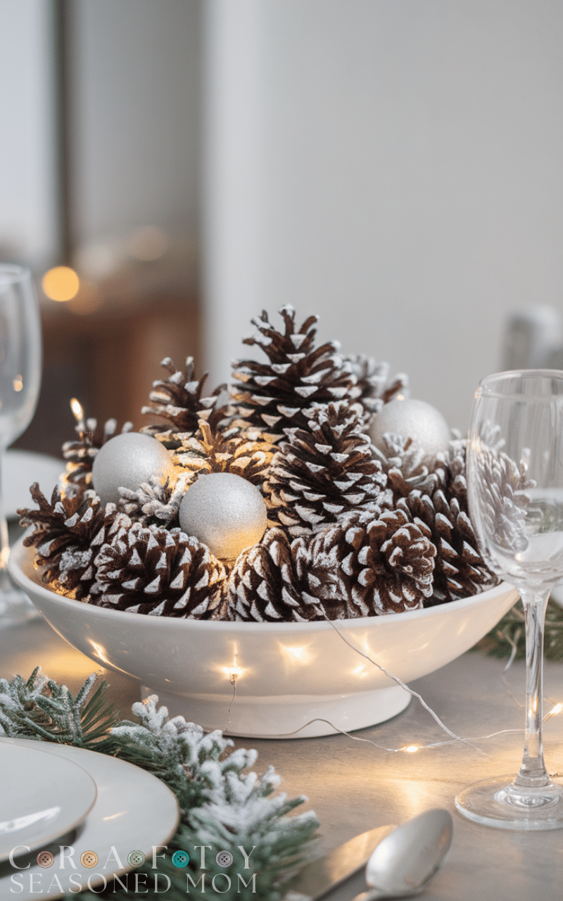 A snowy pinecone bowl is another simple yet beautiful DIY Christmas centerpiece for table because it brings nature indoors. You can take a large white or glass bowl and fill it with pinecones dusted with artificial snow and then you can add silver ornaments and small white lights. The mix of textures and soft glow makes your table look wintery and inviting and it adds a touch of frosty charm without needing too much effort.