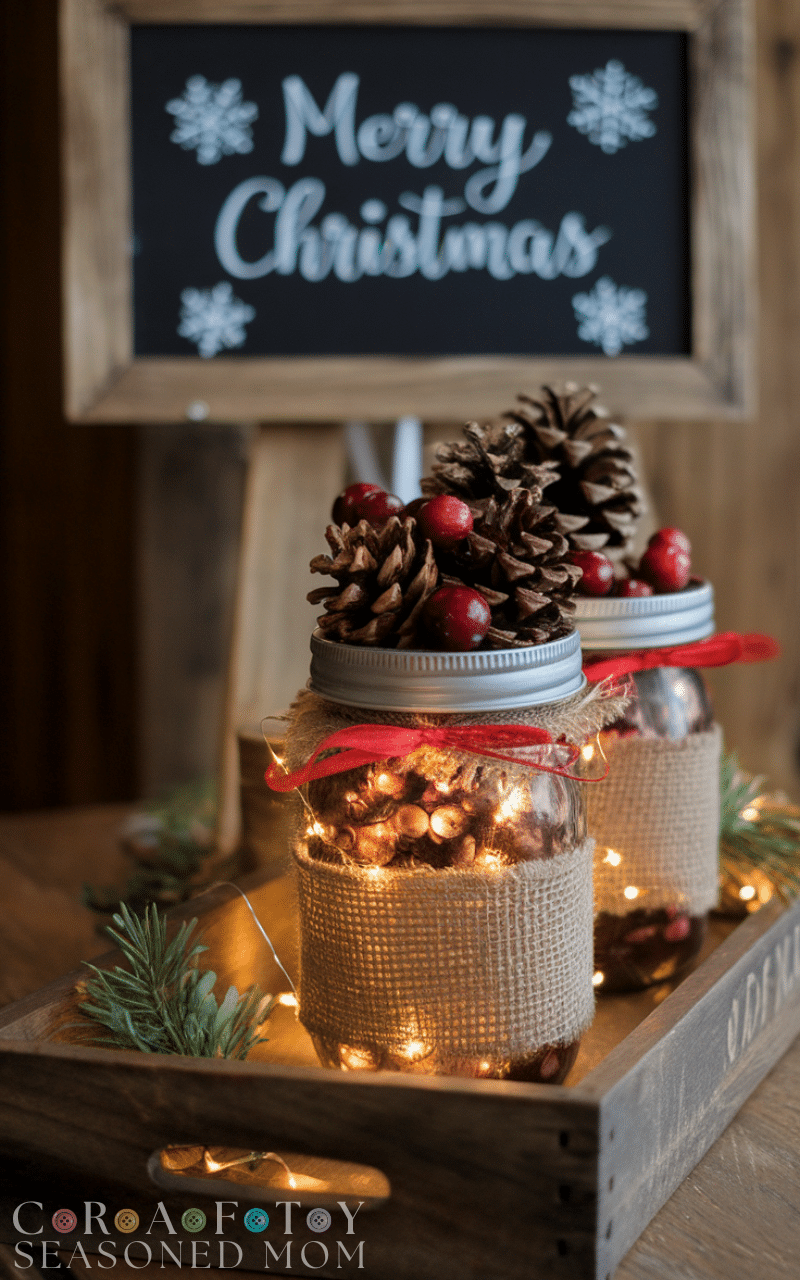 One of the coziest DIY Christmas centerpieces for table is the rustic mason jar design because it brings a warm farmhouse feel to your holiday setting. You can start by filling clear jars with pinecones and cranberries and fairy lights then you can tie twine or burlap around the neck of each jar so they look festive. When you place them on a wooden tray or slice of wood the natural textures combine beautifully and give your dining table a charming rustic glow that feels both simple and magical for Christmas Eve dinners.