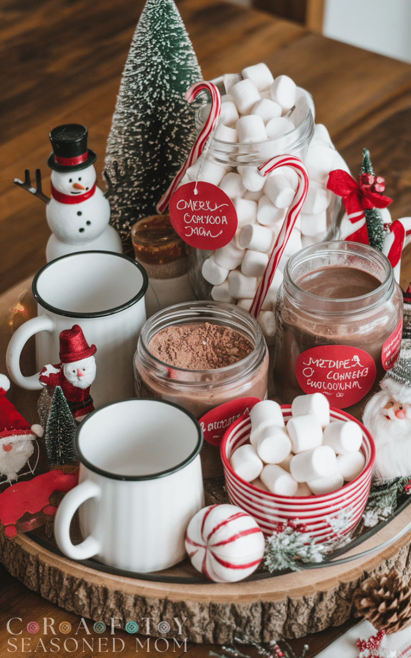 For something cozy and fun, you can create a hot cocoa bar-inspired centerpiece that doubles as a treat station. It’s a creative DIY Christmas centerpiece for table that everyone will enjoy. You can arrange mugs, jars of cocoa mix, marshmallows, and candy canes on a tray with small Christmas decorations. It not only looks festive but also invites guests to enjoy a warm drink together.