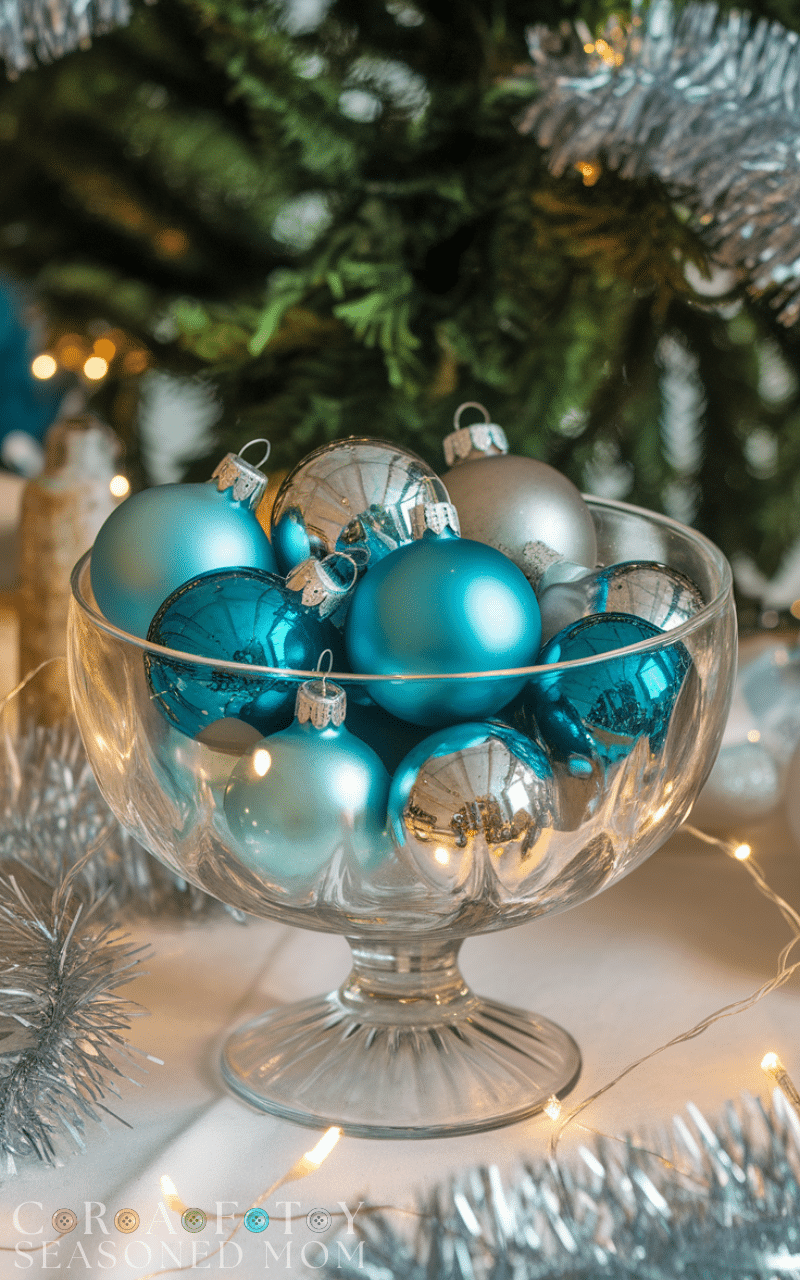 An ornament-filled bowl is one of the easiest DIY Christmas centerpieces for table that still looks stunning. You can take a clear glass bowl and fill it with shiny Christmas ornaments in your favorite color palette. Then you can add tinsel or fairy lights for extra sparkle. This quick and simple design is perfect for those who want instant holiday charm without spending hours crafting.
