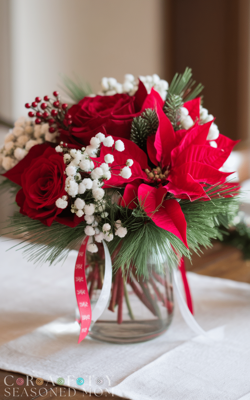 Nothing says Christmas like red and green so this floral arrangement makes a vibrant DIY Christmas centerpiece for table idea. You can mix red roses or poinsettias with green pine branches and white accents like baby’s breath or ribbons. When placed in a glass vase or basket it gives your table a classic and cheerful look that fits perfectly with any holiday theme.