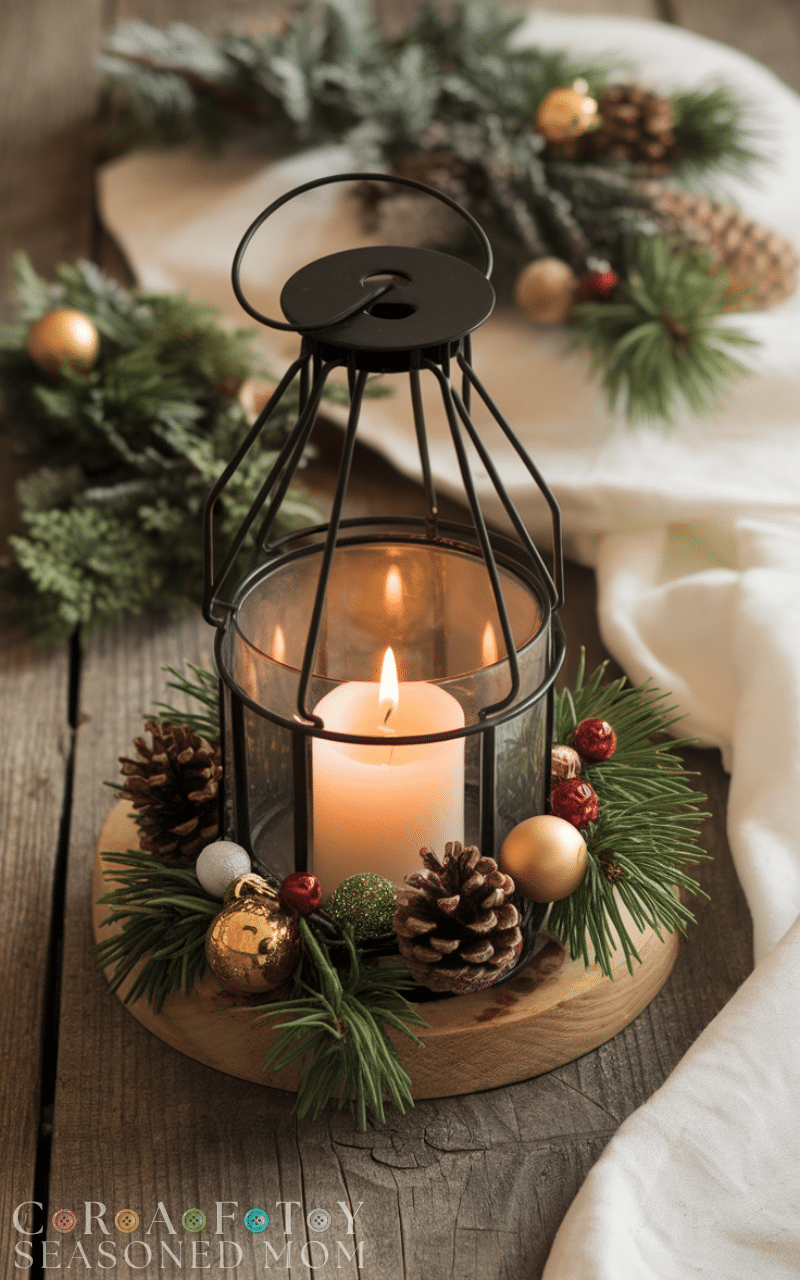 A lantern surrounded by pine branches is one of the coziest DIY Christmas centerpieces for table ideas for a warm glow. You can place a large lantern in the middle of your table and fill it with a candle and some artificial snow. Then you can add pinecones and small ornaments around it. When the candlelight shines through the lantern it creates a soft and inviting atmosphere that feels timeless and traditional.