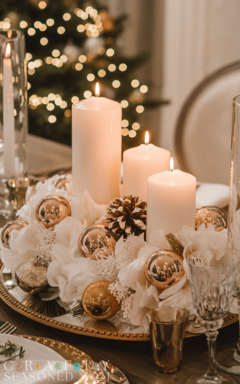 If you want a more sophisticated touch then the white and gold elegance design is a stylish DIY Christmas centerpiece for table that shines. You can combine white candles with gold ornaments and metallic ribbon and then arrange them on a mirrored tray. The reflection of the light with gold tones makes your table look luxurious and perfect for formal dinners or Christmas parties.