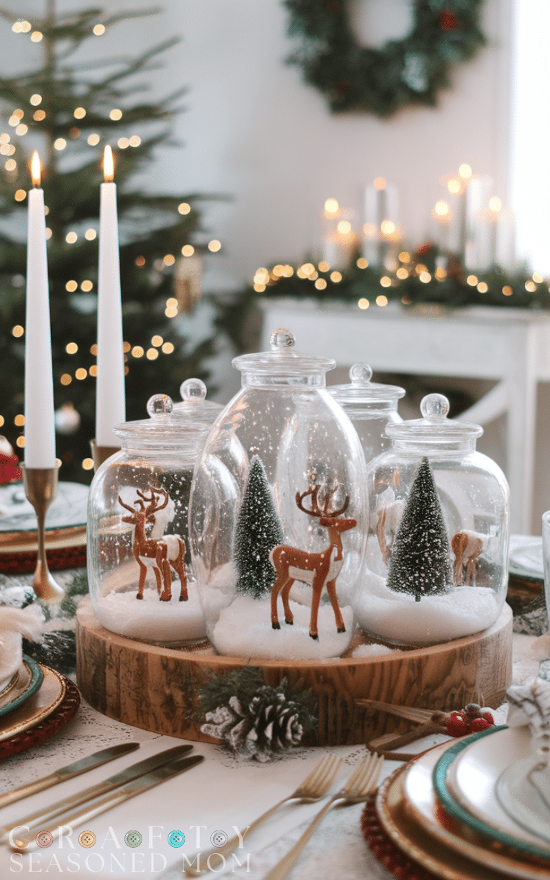 Snow globes always bring a sense of magic so turning them into DIY Christmas centerpieces for table is such a fun idea. You can create your own by placing small figurines like reindeer or trees inside clear glass jars and then adding artificial snow and glitter. When you group several jars together in the middle of your table they create a whimsical snowy village that looks enchanting and festive.