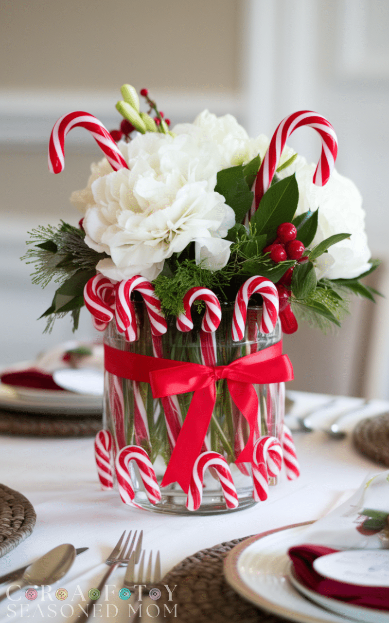 For a playful and colorful idea, you can make a candy cane vase centerpiece because it’s a delightful DIY Christmas centerpiece for table that doubles as a sweet treat. You can glue candy canes around a glass vase and then tie a red ribbon around it and fill it with white flowers or greenery. This cute and bright design instantly adds holiday cheer and is a hit with kids and adults alike.