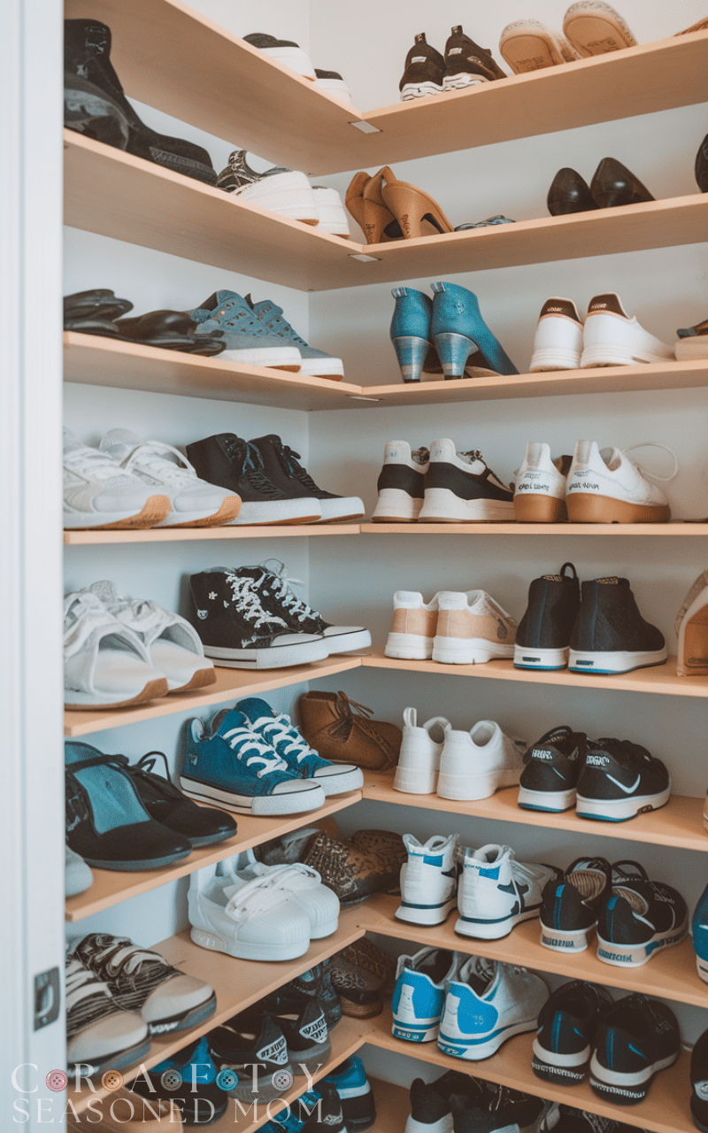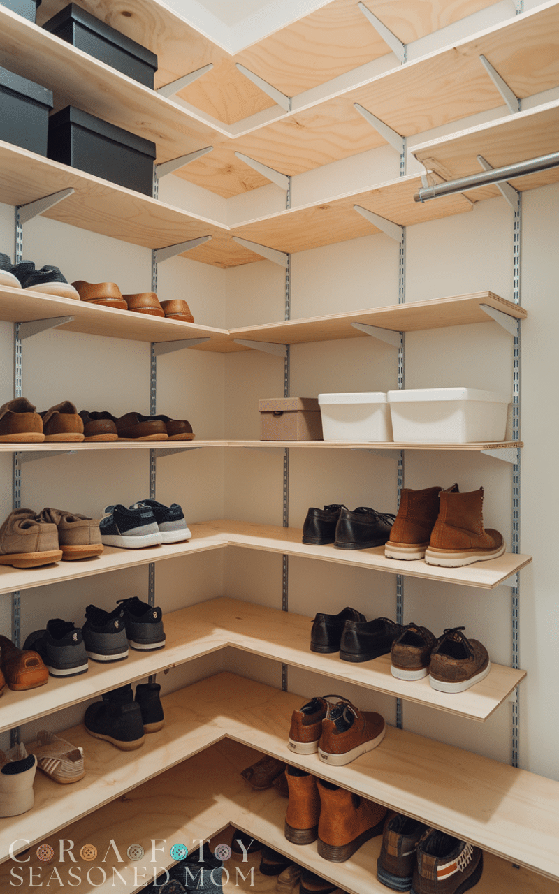 Shoes often create the most clutter. Building dedicated DIY closet shelves for shoes solves this problem instantly. Install narrow, evenly spaced boards along one wall to hold multiple pairs. Angle them slightly for easier visibility. DIY closet shelves designed specifically for shoes keep everything organized and accessible.