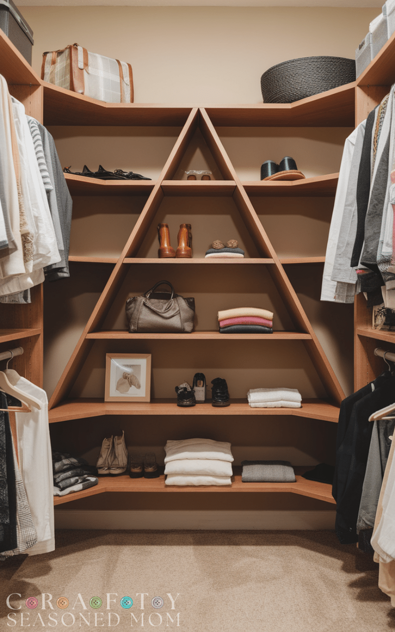 Corners are often wasted space, but adding DIY closet shelves in the corner maximizes every inch. Install triangular or L-shaped wooden shelves to hold accessories or folded clothing. This idea works especially well in walk-in closets. DIY closet shelves placed in corners make the closet feel balanced and organized while using space that would otherwise stay empty.