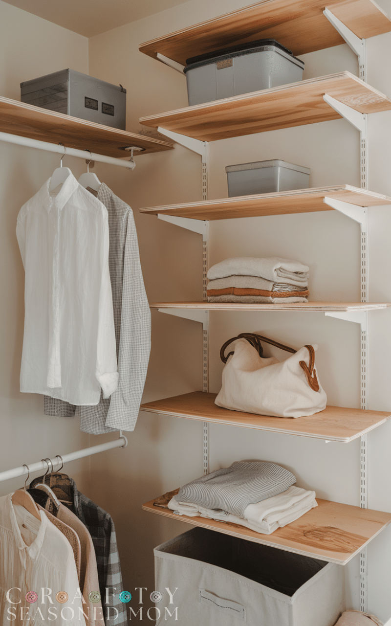 If you want flexibility, adjustable track systems are ideal for DIY closet shelves. Install vertical tracks on the wall and add movable brackets and boards. This allows you to change shelf heights whenever your storage needs change. DIY closet shelves with adjustable systems are perfect for growing wardrobes or seasonal storage.