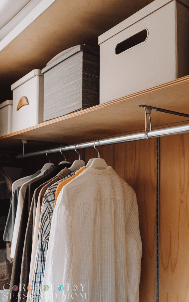 If your closet allows, install DIY closet shelves above a double hanging rod system. This setup gives you space for short clothing items and folded storage above. Combining rods and shelves creates a smart, balanced layout. DIY closet shelves paired with hanging sections maximize functionality in small spaces.
