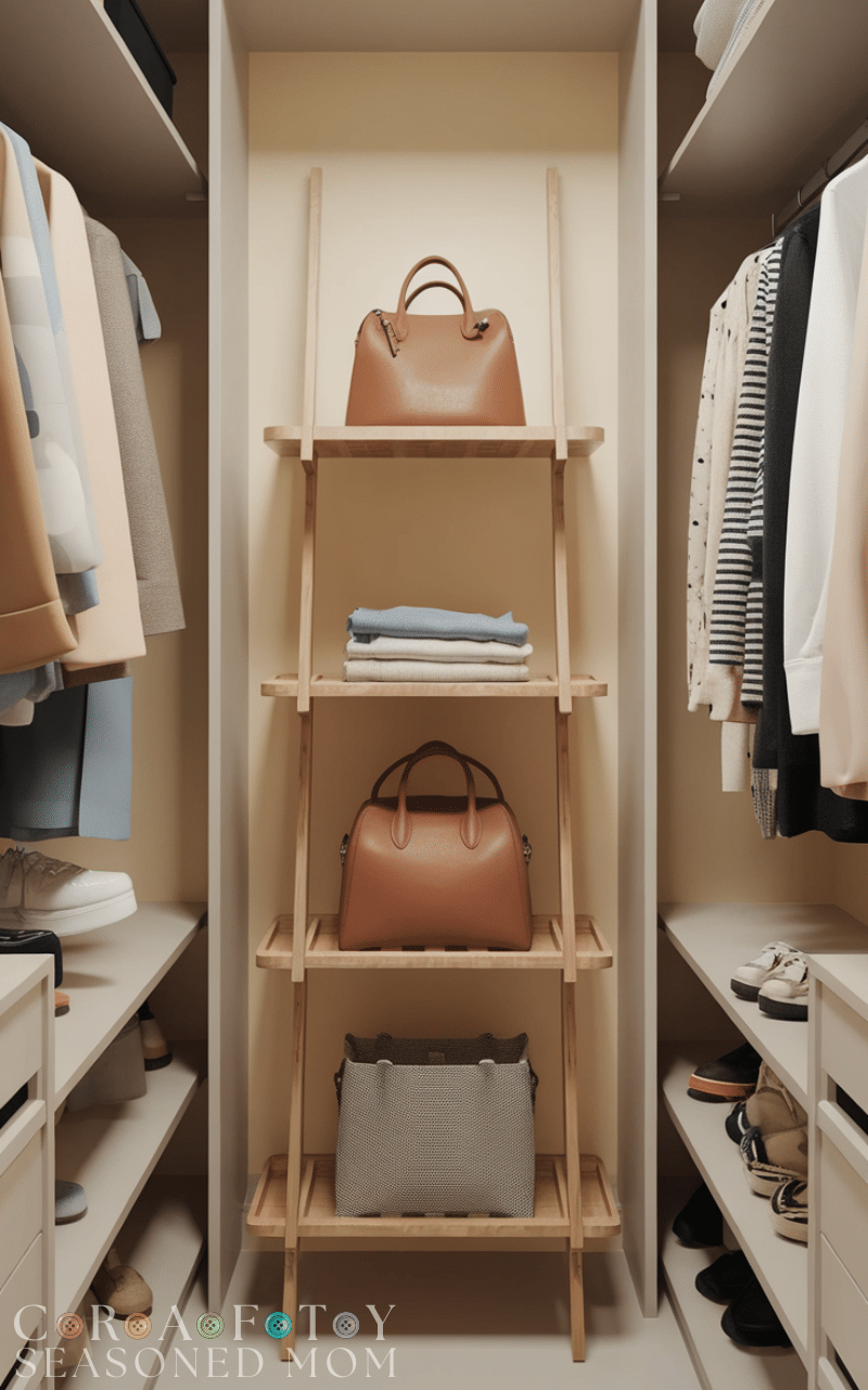 A slim ladder shelf placed inside a walk-in closet adds vertical storage without installation. This creative DIY closet shelves idea is perfect for displaying bags or folded items. Choose a narrow design to avoid crowding the space. DIY closet shelves using ladder styles combine functionality with a decorative touch.