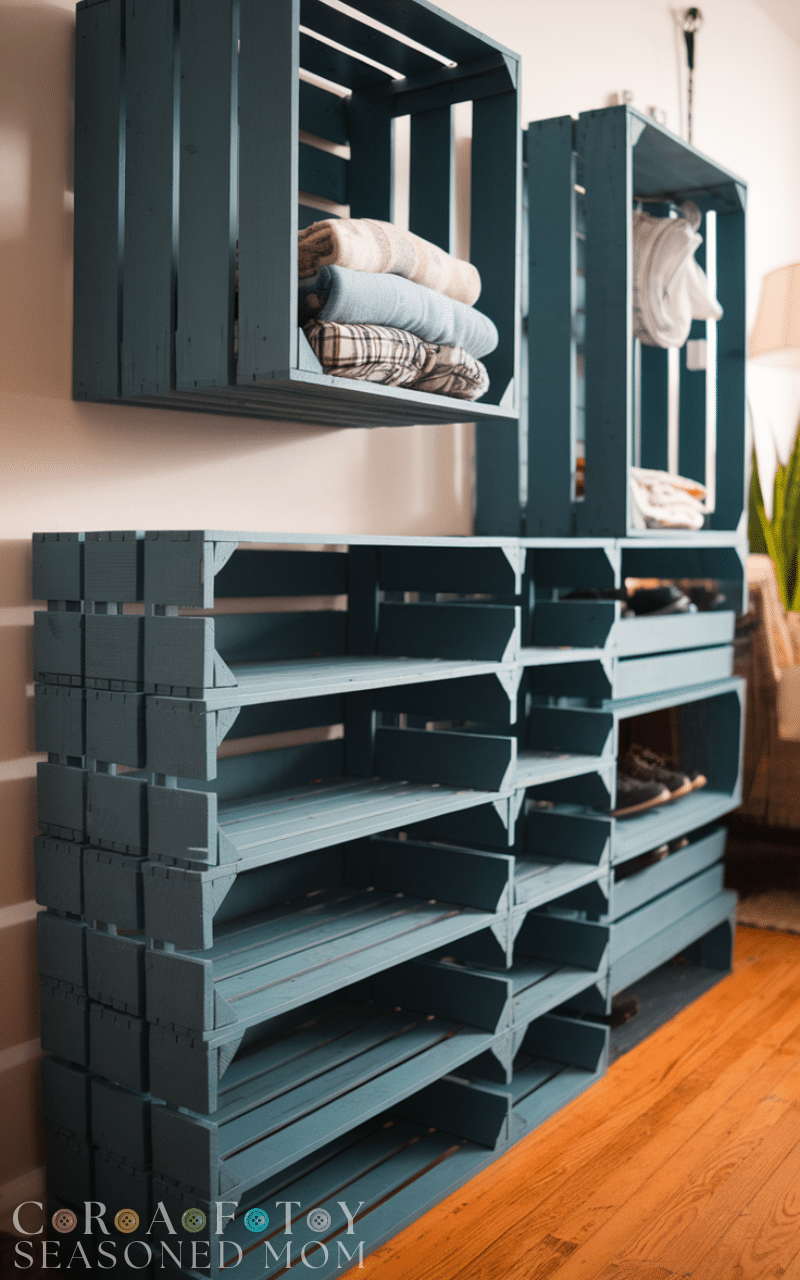 Wooden crates can be stacked or mounted to create creative DIY closet shelves. You can secure them horizontally for shoes or vertically for folded clothes. Paint or stain the crates to match your room décor. DIY closet shelves made from crates add character while staying affordable and functional.