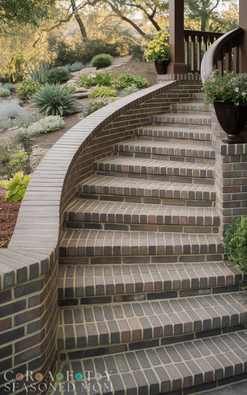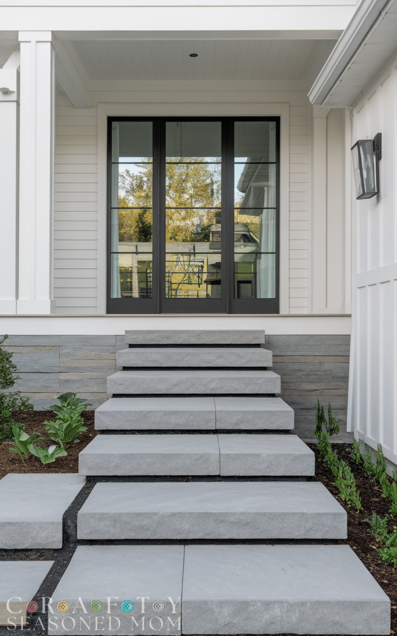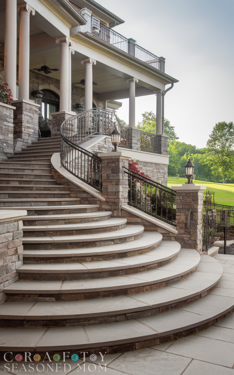 Curved steps add a graceful flow to your entrance front porch steps. Instead of a straight staircase, a gentle curve creates a sense of movement and elegance, making your home feel inviting from the first glance. Curved steps work well with brick, stone, or concrete materials, and you can even combine textures for a more dynamic look. They’re ideal for homes with circular driveways or landscaped gardens because they guide visitors naturally to your front door. These entrance front porch steps are both functional and visually stunning.
