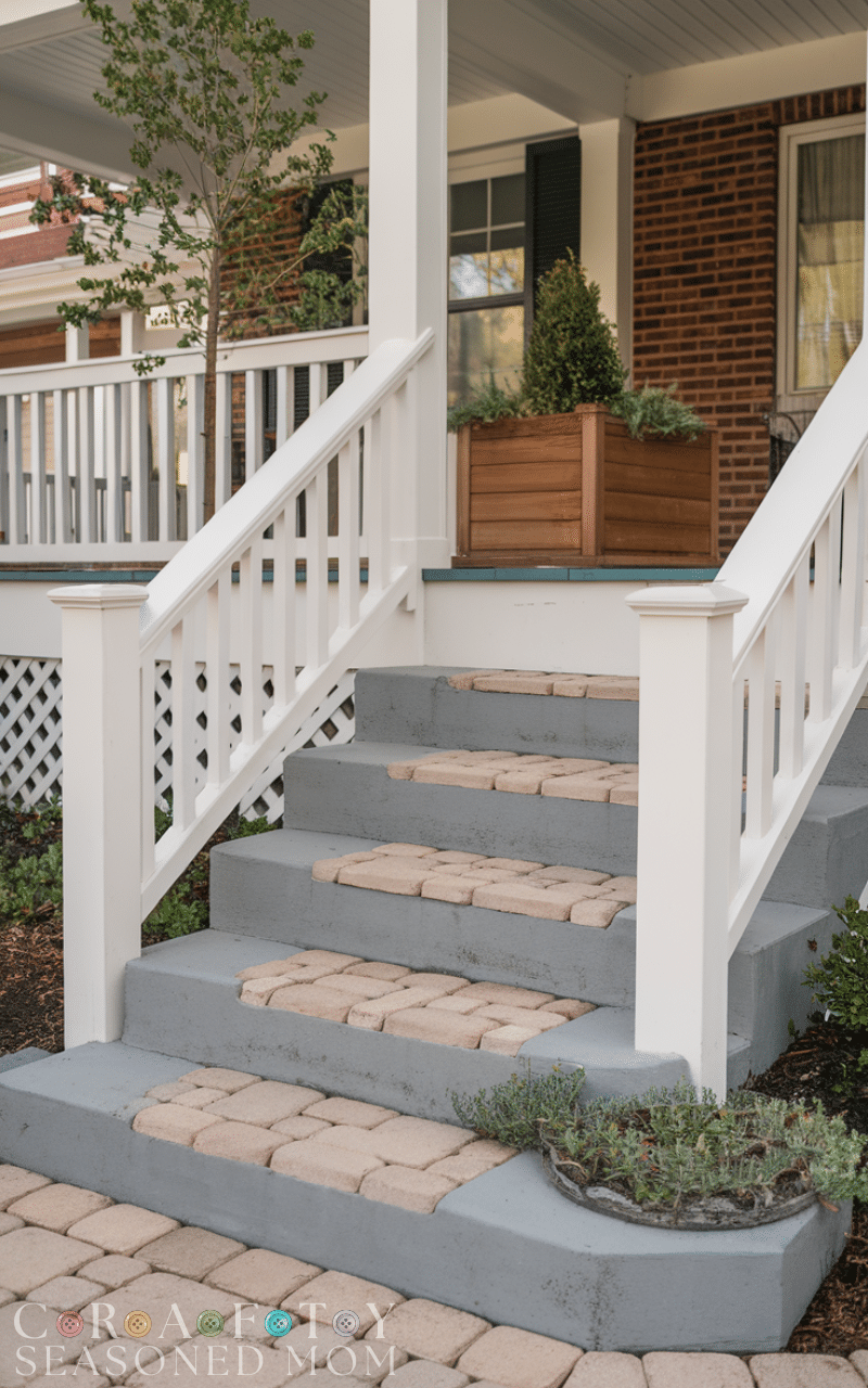 Concrete steps combined with decorative pavers give a modern and polished finish to entrance front porch steps. The concrete provides strength and longevity, while pavers add texture and color variety, allowing for creative patterns. You can choose brick-style pavers, geometric patterns, or natural stone inserts to match your home’s exterior. These steps are also easy to maintain and can withstand heavy foot traffic. Adding planters or railings complements the design, making these entrance front porch steps both practical and visually appealing.