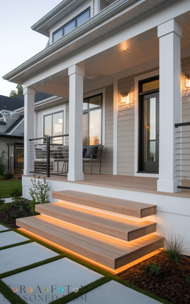 Illuminating your entrance front porch steps with lights adds both style and safety. LED strip lights, recessed step lights, or solar-powered options can highlight each step beautifully at night. Lighting not only makes the steps safer to navigate but also adds a welcoming glow for visitors. You can mix warm and cool tones to match your home’s vibe. Step lighting works with any material, from wood and stone to concrete, enhancing the beauty of your entrance front porch steps while keeping functionality in mind.