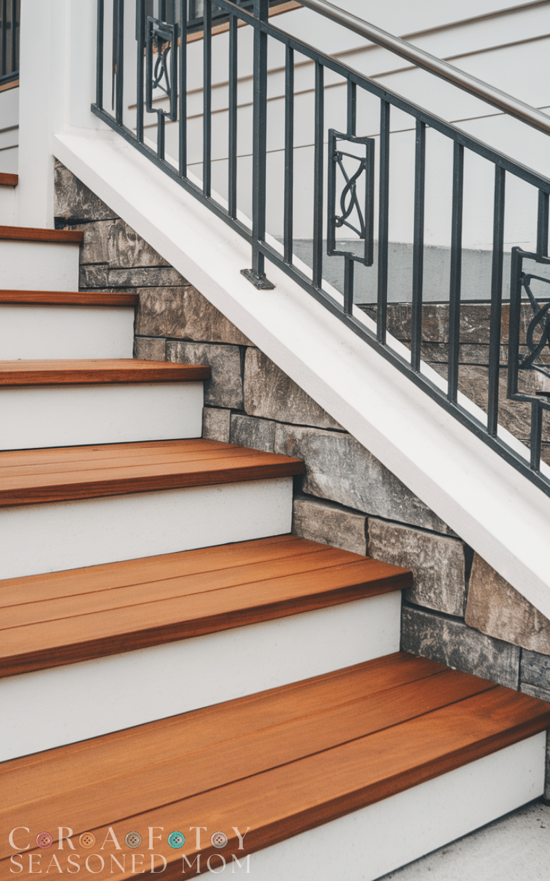 Combine materials like wood, stone, and metal for unique entrance front porch steps. For example, wooden treads with stone risers or metal railings can add modern flair to your porch. Mixing textures makes your steps visually engaging and allows you to experiment with contrasting colors and patterns. These entrance front porch steps work well for homes that want to showcase creativity and individuality. They’re durable, stylish, and provide a conversation piece for guests even before they enter your home.