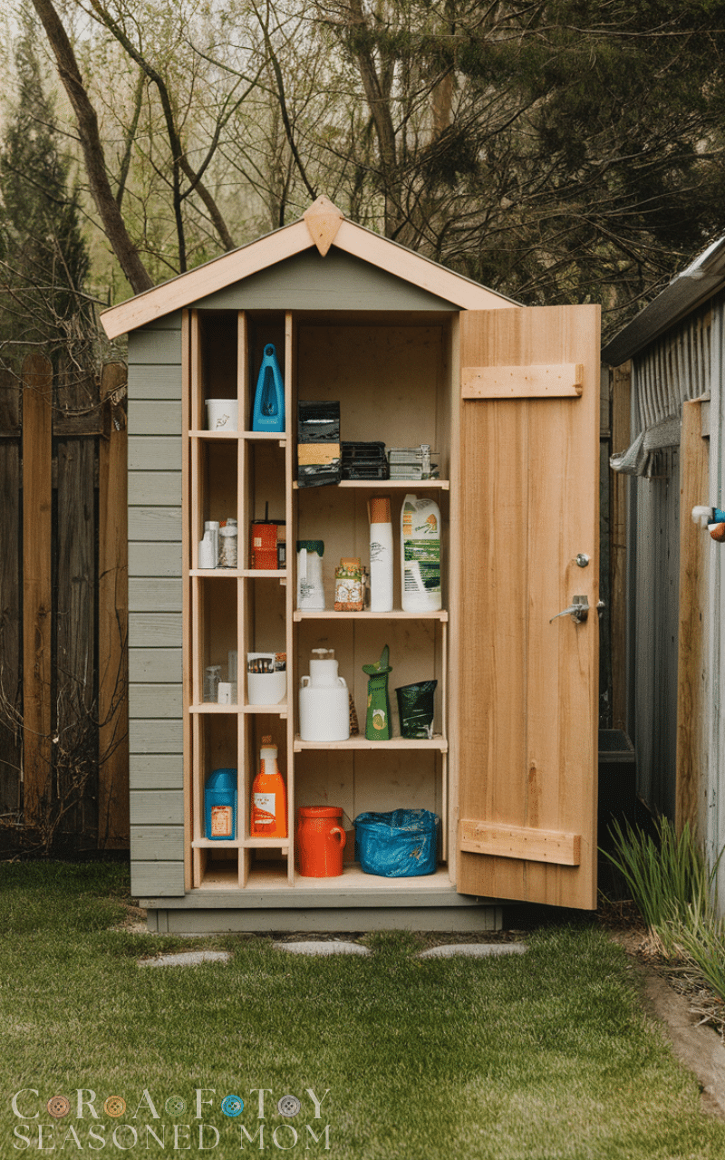 A garden shed benefits from plastic bins or baskets for seeds, gloves, and smaller supplies. Label for easy access. With garden shed ideas, this keeps everything contained and reduces messy clutter.