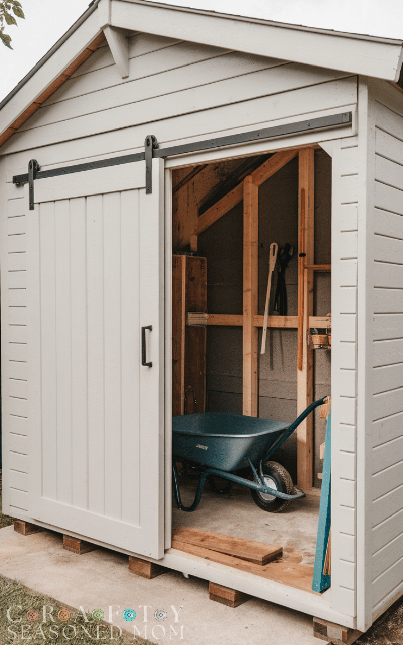 Garden shed ideas include sliding or double doors for easy access to large tools or wheelbarrows. With a garden shed, this makes storage functional without wasting space on swing doors.