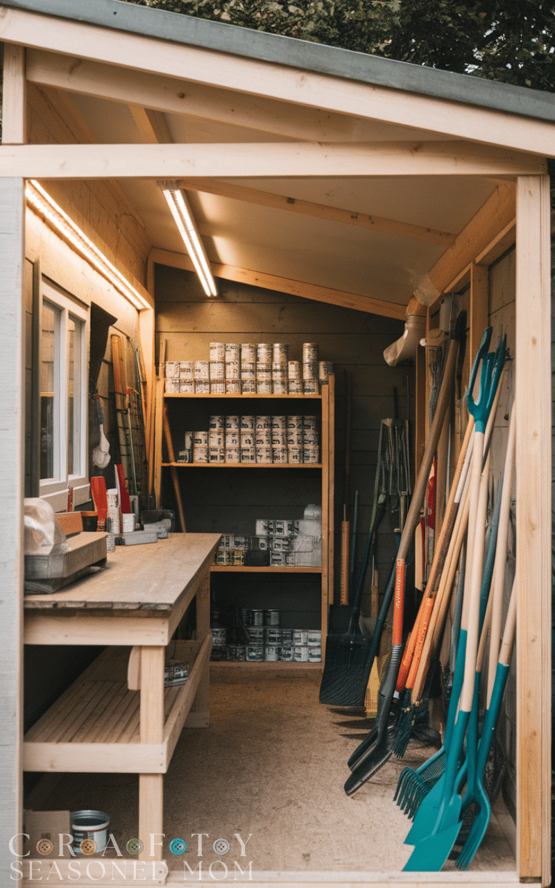 A garden shed includes pegboards, hooks, and magnetic strips to hang tools neatly. This keeps frequently used tools visible and accessible. With garden shed ideas, organized tools reduce clutter and make gardening more efficient.