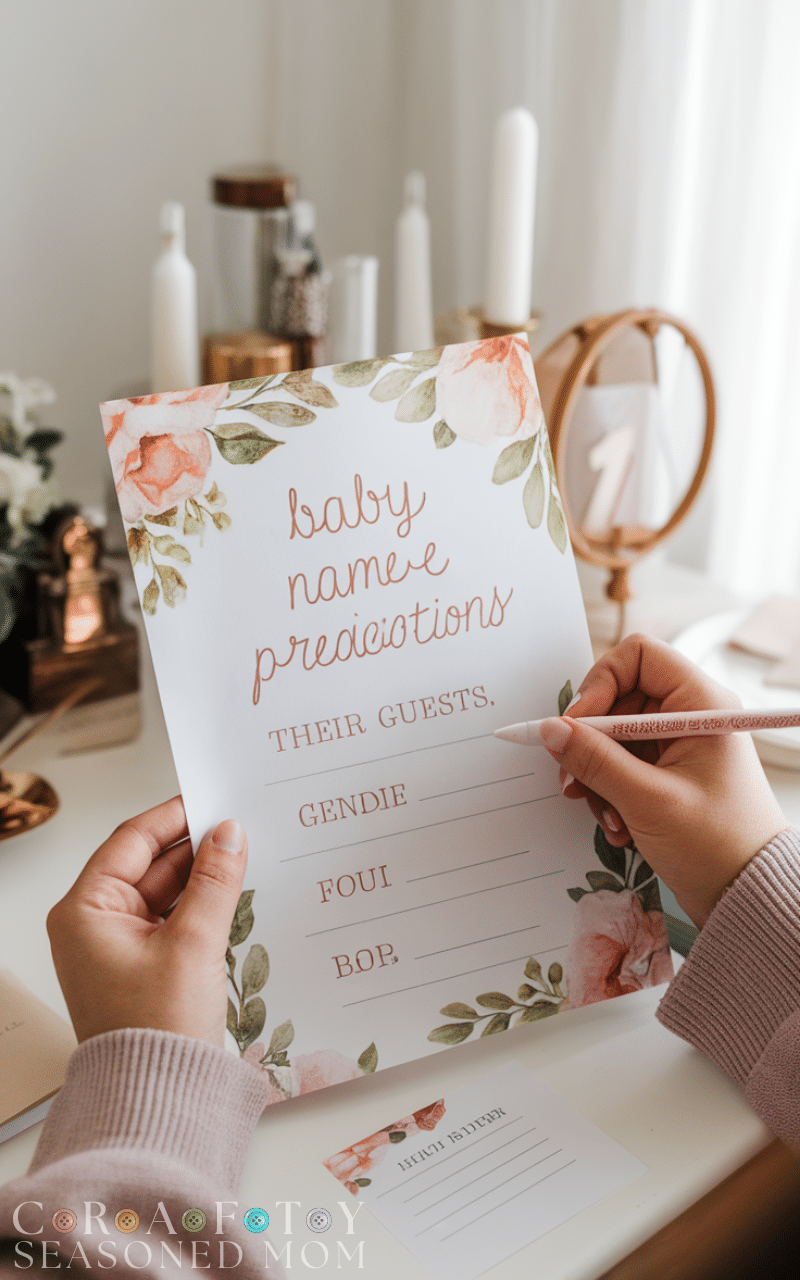 This creative idea stands out among gender reveal games. Guests write down baby name suggestions based on their gender guess. Once the gender is revealed, the correct predictions can be read aloud. It’s a fun keepsake idea and encourages guests to get creative.