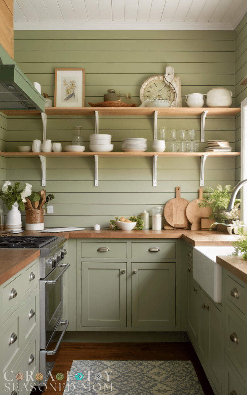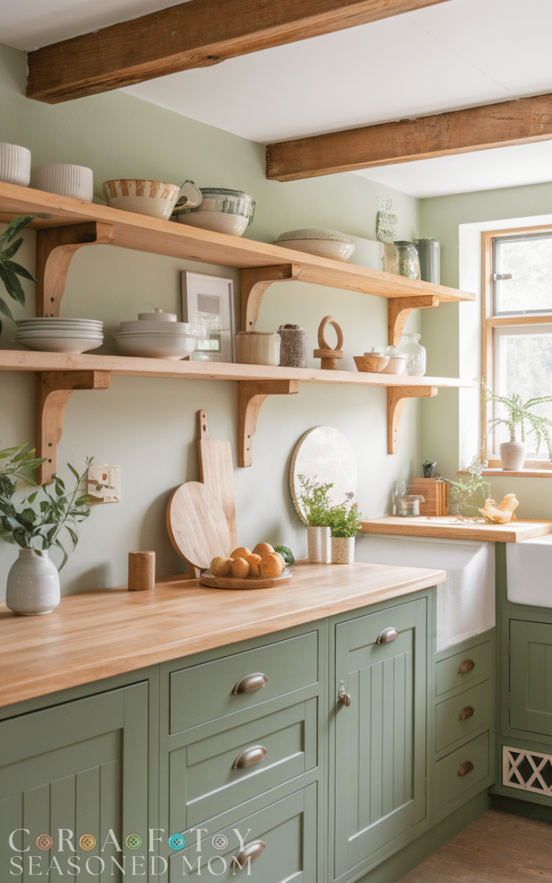 Open shelving is a beautiful way to highlight the charm of Green Cottage Kitchen Designs and it works wonderfully when the shelves are painted in soft rustic shades of green and this style gives your kitchen a warm and airy feeling because everything is displayed in a simple and inviting way and it also adds personality through dishes and glassware that become part of the decor and this idea fits perfectly with the cozy cottage look because the green tone brings nature into your space and makes it feel calm and relaxed and it also helps the kitchen look bigger because open shelves create openness rather than heavy enclosed cabinets and when you choose a muted green shade you add a peaceful touch to your kitchen and create a natural flow that feels both timeless and welcoming and this is why open shelving is one of the best Green Cottage Kitchen Designs for a bright and friendly atmosphere.